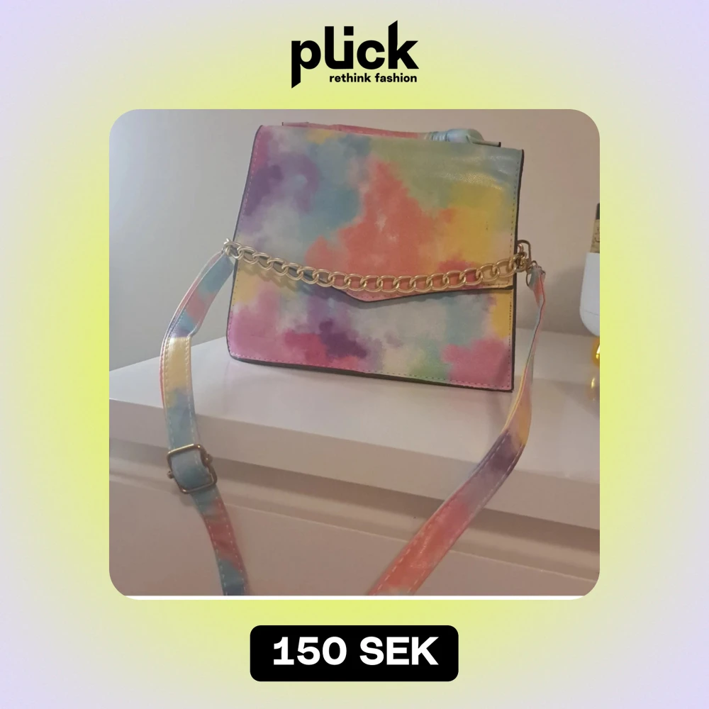 Säljer en superfin axelväska i regnbågens alla färger! Väskan har ett coolt mönster som påminner om akvarell och en snygg kedjedetalj på framsidan. Den har en justerbar axelrem och stängs med en tryckknapp. Perfekt för att liva upp vilken outfit som helst! 🌈✨