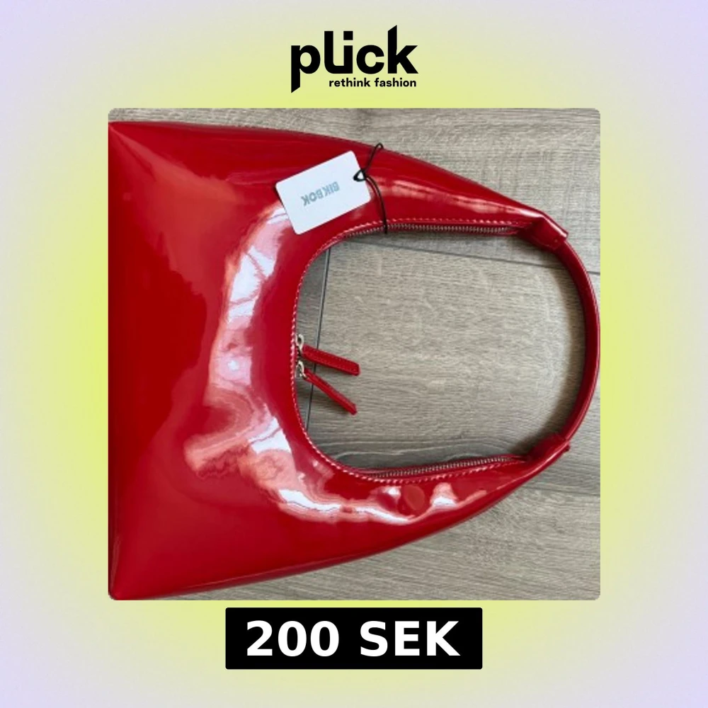 Snygg röd axelväska från Bik Bok med glansig finish och stilren, trekantig form. Väskan har en matchande röd dragkedja och ett smidigt handtag som gör den enkel att bära. Perfekt för att addera färg till din outfit.