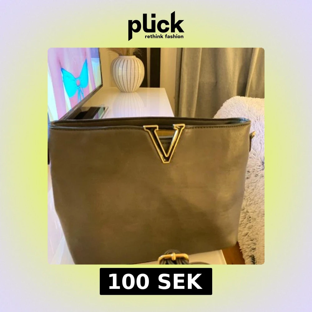 Snygg grå väska med ett stort V i guld på framsidan. Man får med sig ett band till med. Vet ej märket för köpte på busfröt (en secondhandbutik). Skriv vid frågor eller intresse!