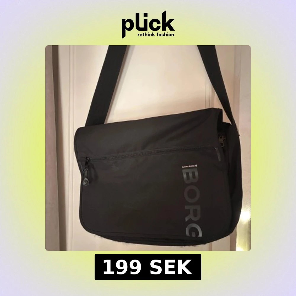 Snygg svart axelväska från Björn Borg med stort lock, dragkedjeficka framtill och justerbar axelrem. Kan väljas att inte stängas med kardborre då man går med två lappar som täcker över karbonaten❣️4 st stora fickor. Lite sliten på under sidan men syns knappt. Kolla sista bilden. Perfekt för skola eller jobb