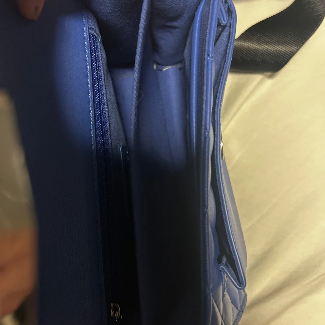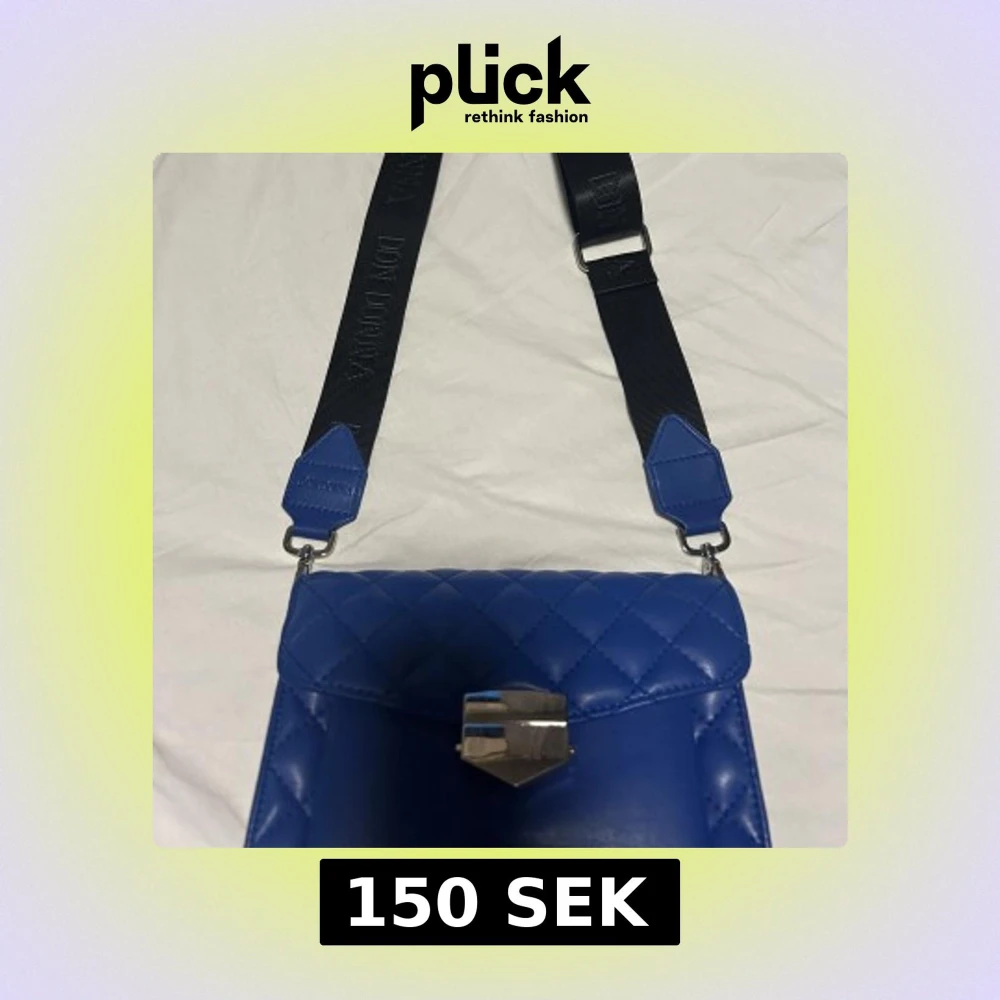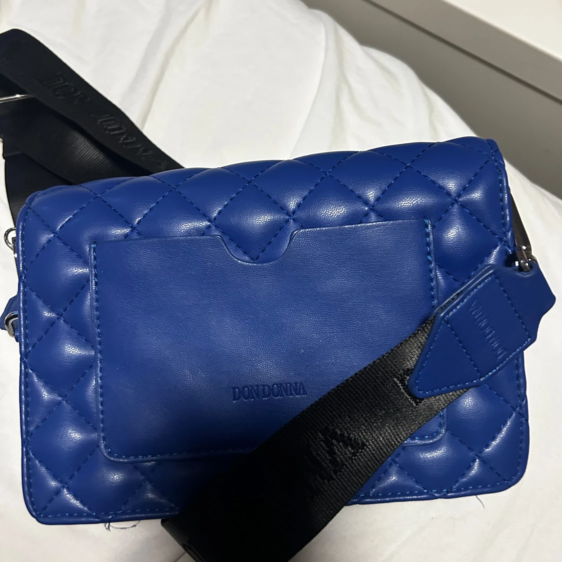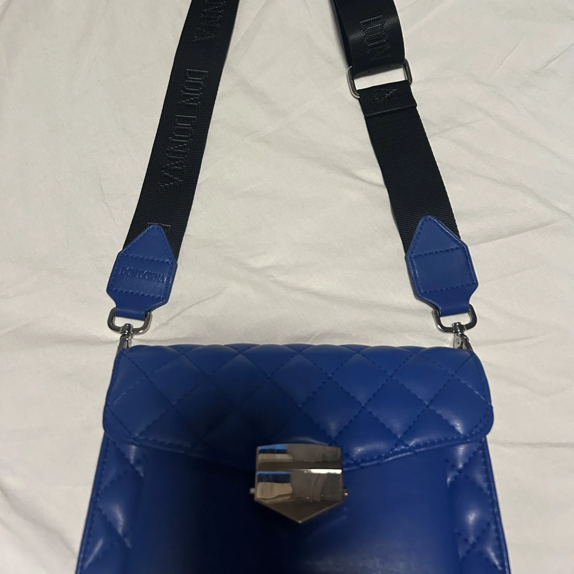 Blå axelväska från Don Donna och bred svart axelrem med logga. Väskan har silvrigt spänne framtill.
