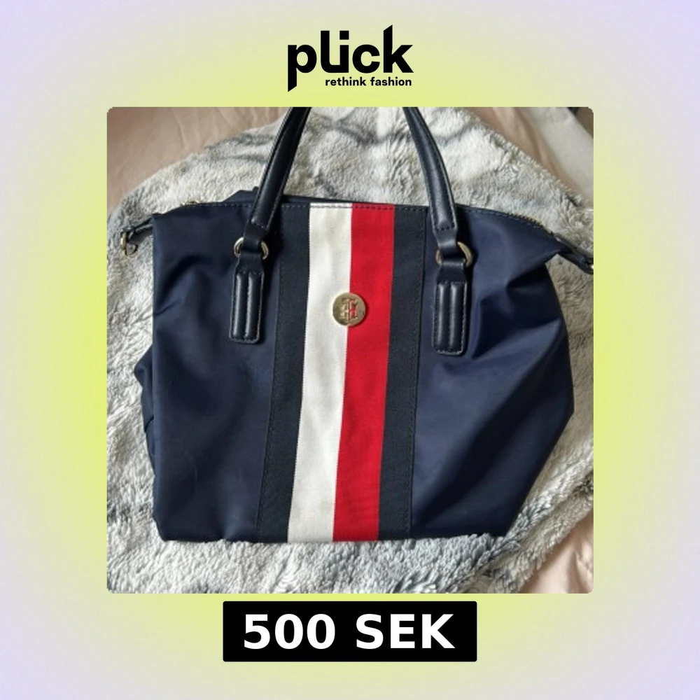 Snygg blå axelväska från Tommy Hilfiger med röd och vit randdetalj. Väskan har ett guldigt TH-emblem och dragkedja. Perfekt för att ge din outfit en stilren touch.