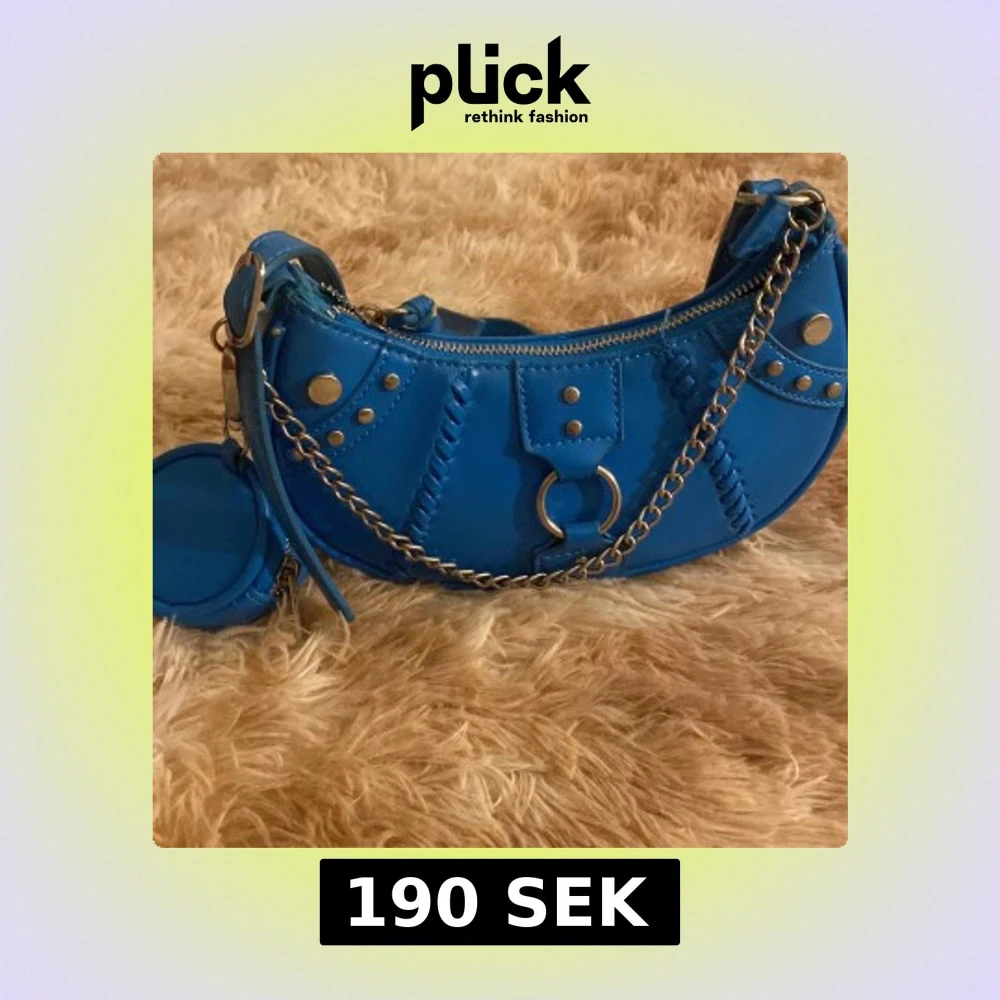 Cool blå axelväska i syntet med silvriga nitar, kedja och dragkedja. Halvmåneformad design med dekorativa sömmar och extra liten rund ficka. Perfekt för dig som vill sticka ut med en färgstark accessoar.