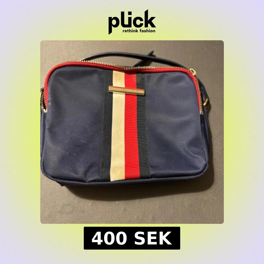 Snygg marinblå axelväska från Tommy Hilfiger med klassiska ränder i rött, beige och svart framtill. Väskan har guldfärgade dragkedjor och en stilren, boxig form. Perfekt för att bära det viktigaste med stil.