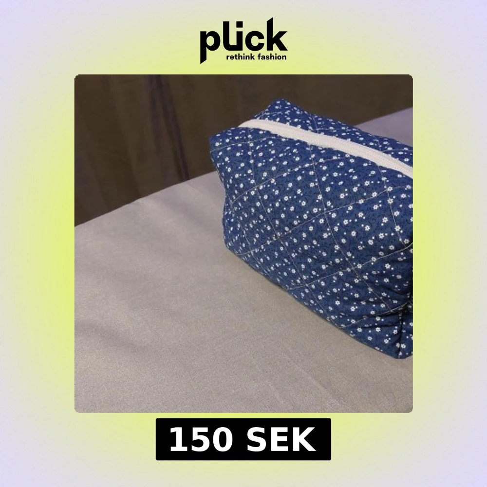 En necessär i blått tyg med små vita blommor och vita sömmar i rutmönster. Necessären har en vit dragkedja upptill och är perfekt för smink, pennor mm. Rektangulär form och mjuk känsla, passar lätt i väskan eller på resan. Bredd: ca 9cm Längd: 19cm djup: 10cm