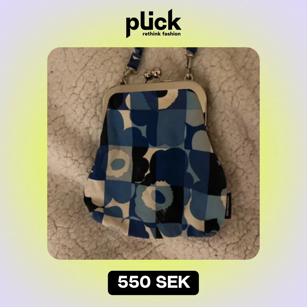 Säljer en superfin blå mönstrad väska från Marimekko. Den har ett coolt retroinspirerat mönster i olika blå nyanser och vitt. Väskan har en metallram med en klassisk bygelstängning och en kort axelrem. Perfekt för att ge en färgklick till din outfit!