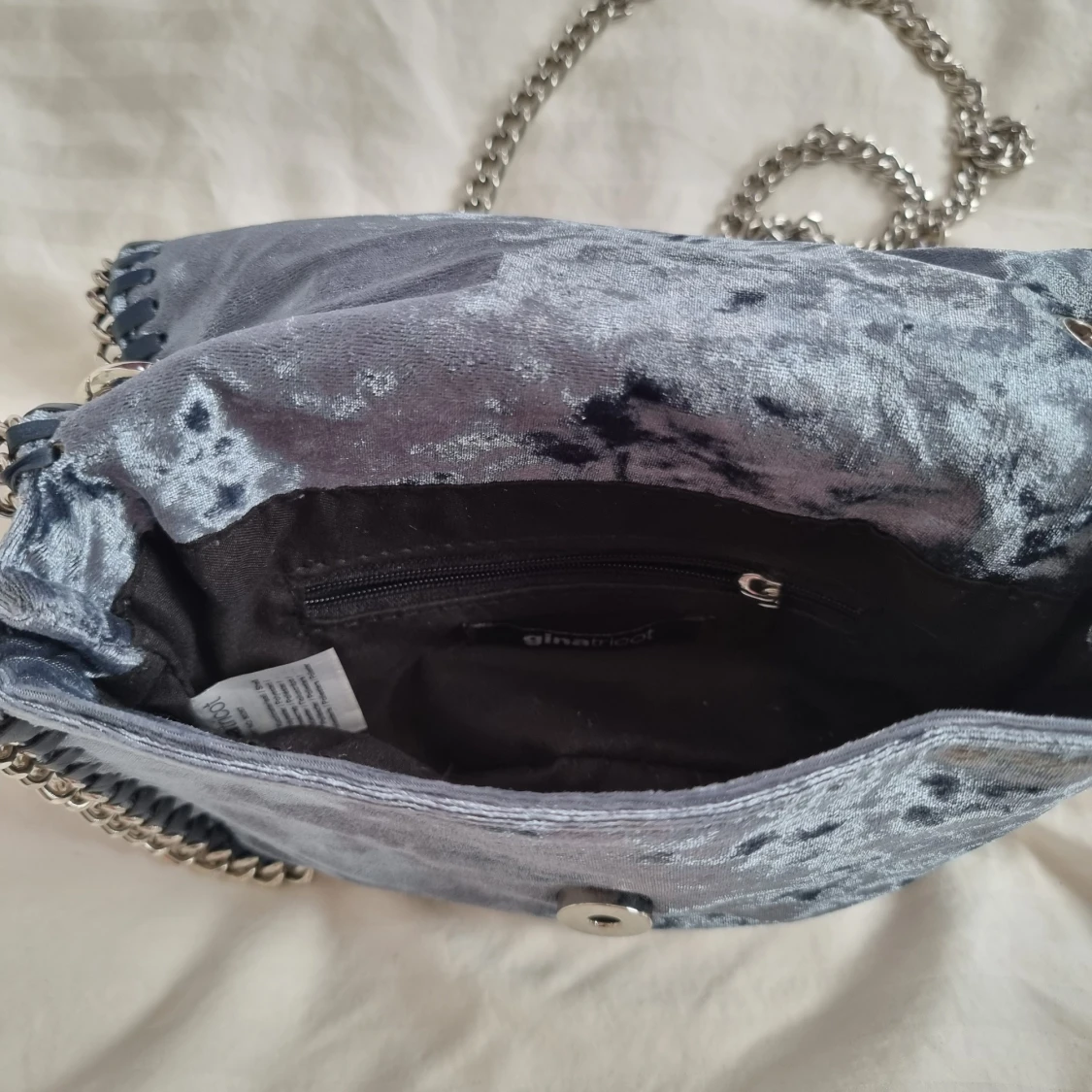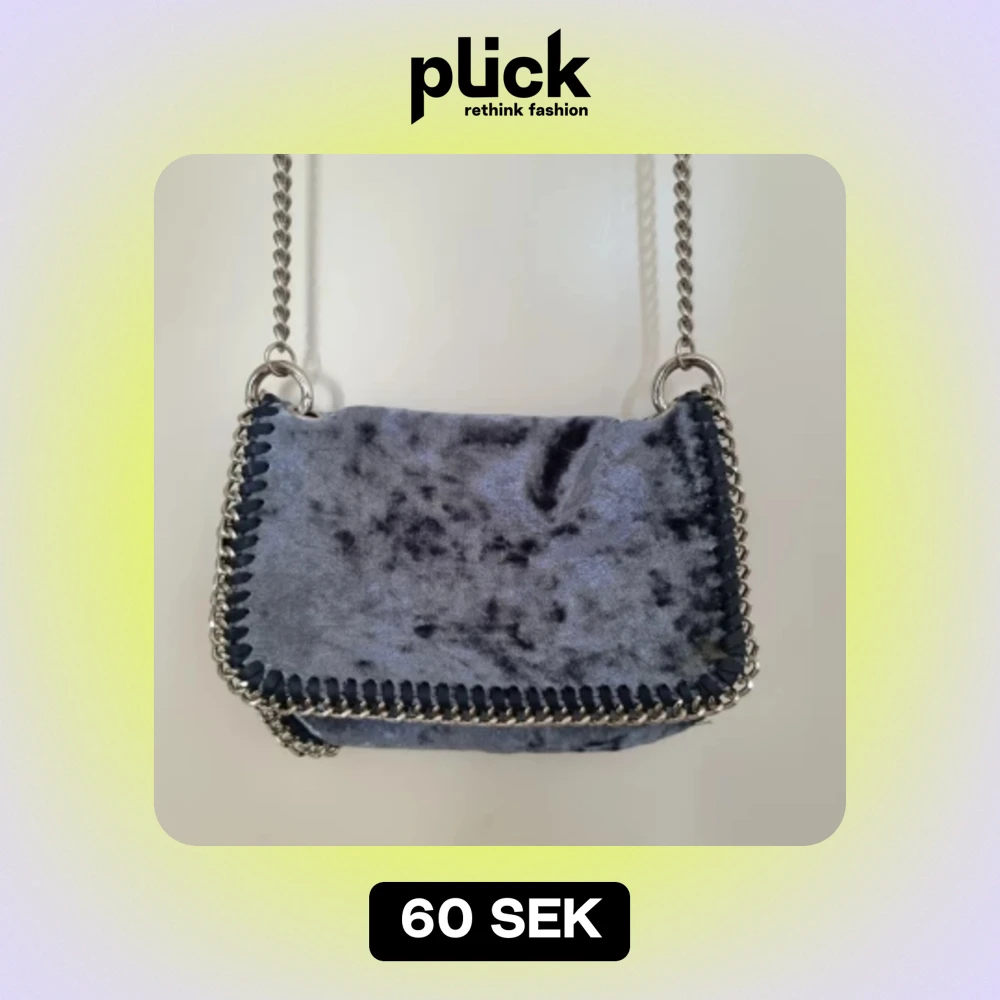Handväska i blå sammet med silverkedja. Fint skick. Litet innerfack med dragkedja.