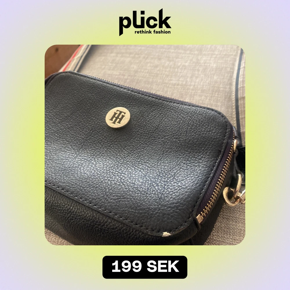Snygg mörk blå axelväska i skinn från Tommy Hilfiger😍😍 med guldfärgade detaljer och dragkedja. Väskan har en justerbar axelrem med röd och vit randig design. Perfekt för att bära dina nödvändigheter med stil. Dragkedjan där fram har gått av men går fortfarande att använda som vilken annan💕💕