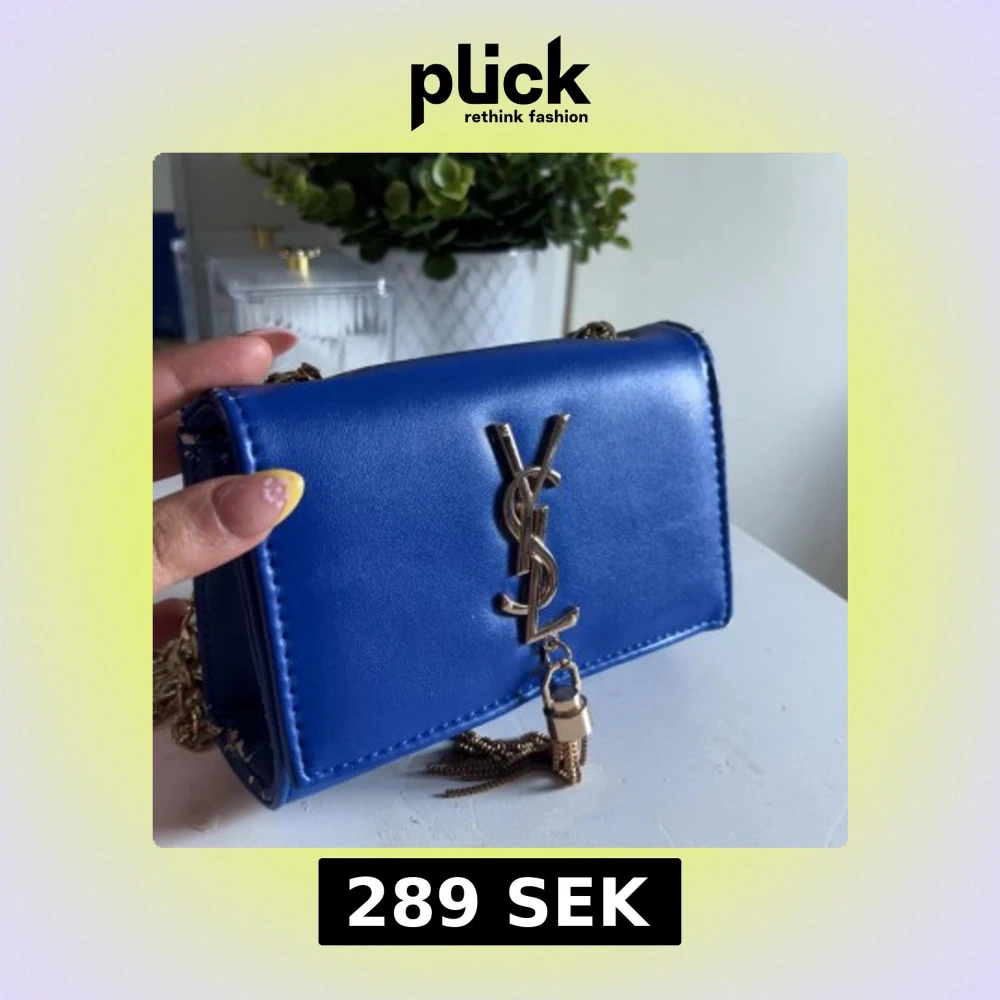 Snygg blå axelväska från YSL med guldfärgad kedja och ikonisk YSL-logga framtill. Väskan har ett dekorativt hänglås med tofsdetalj och röd insida. Perfekt storlek för det viktigaste och ger en lyxig touch till din outfit.