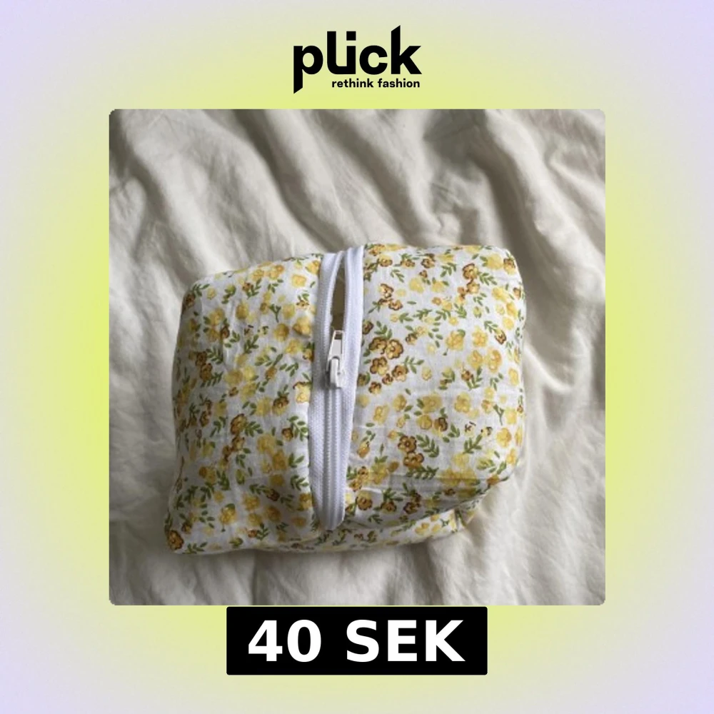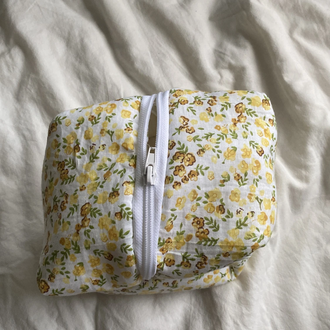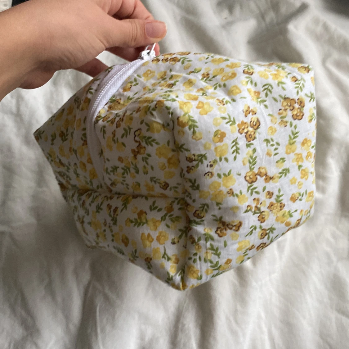 Söt necessär i vit bomull med små gula blommor på. En boxig form som rymmer mycket. Perfekt för smink eller småprylar