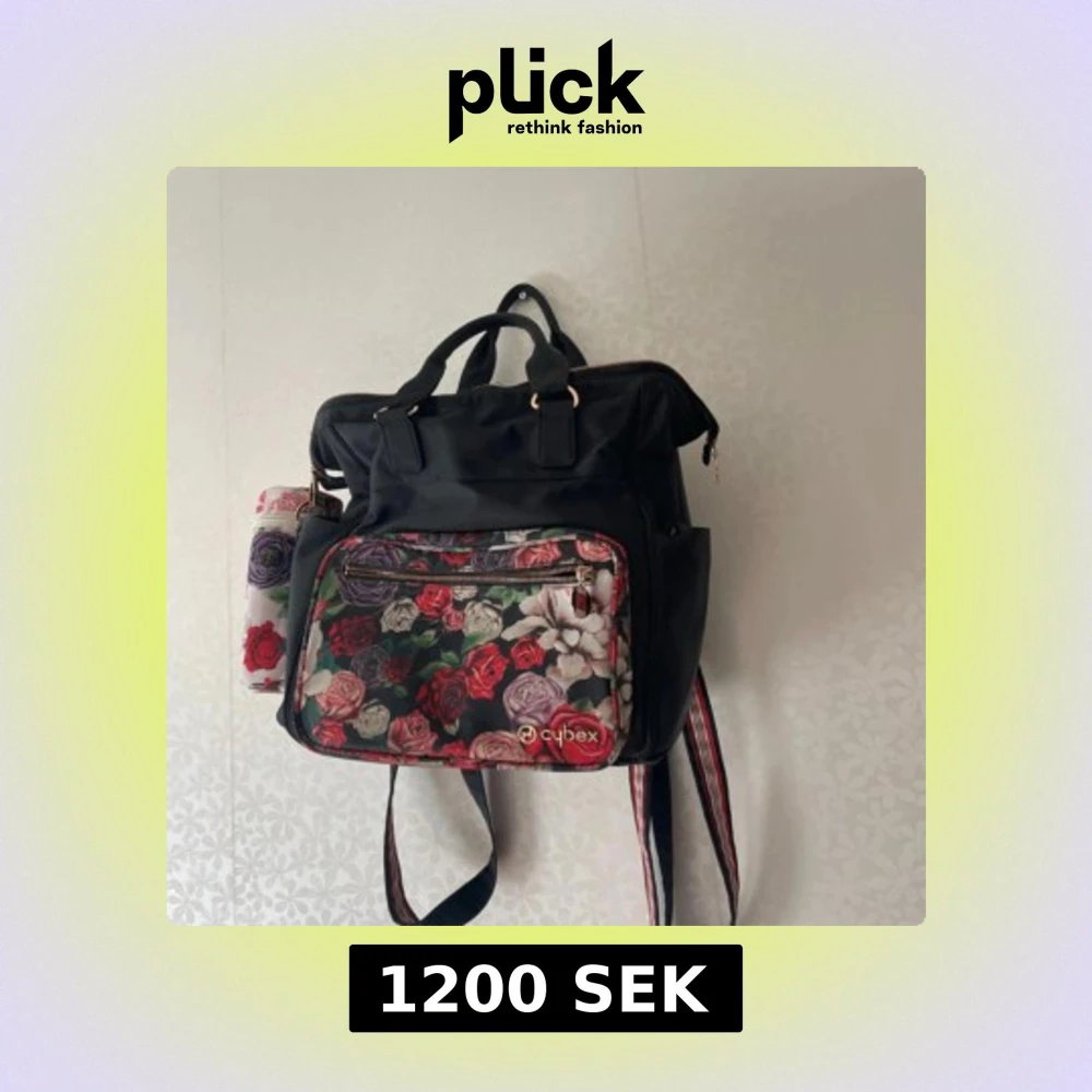 Säljer en svart ryggsäck från Cybex med blommigt mönster i rött, lila, beige och grönt på både utsidan och insidan. Väskan har guldfärgade detaljer, dragkedja och flera fack. Axelremmarna är randiga och väskan har både handtag och axelremmar.