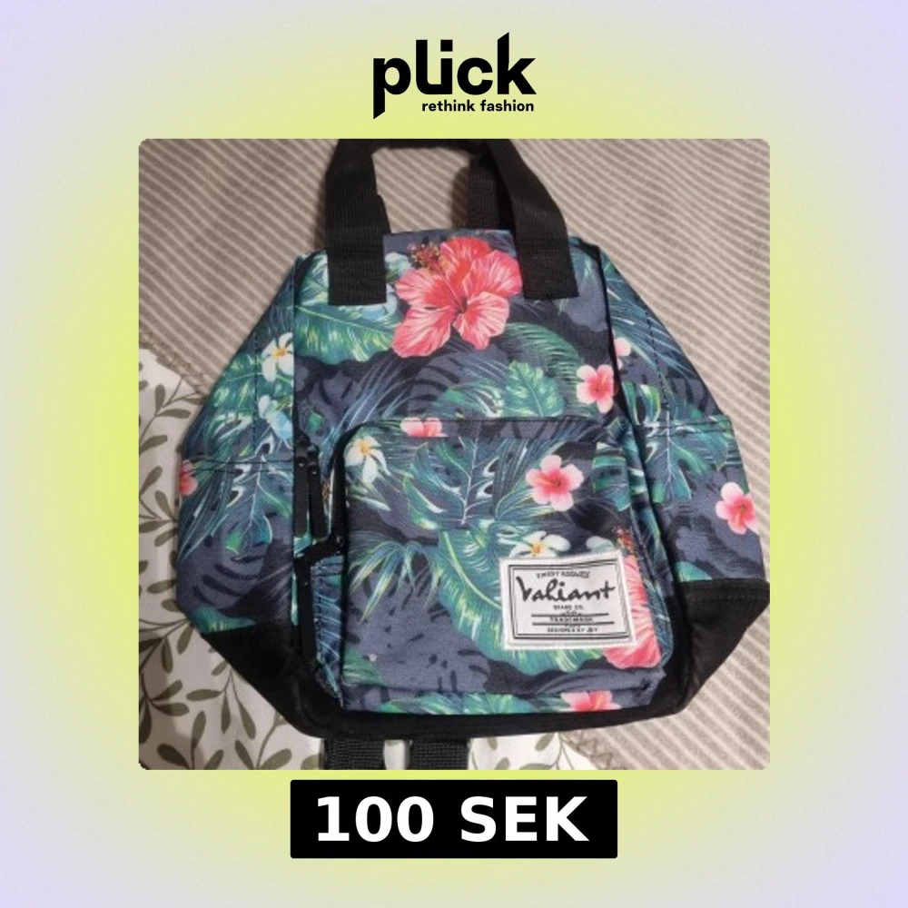 Färgglad ryggsäck från Valiant med tropiskt blommönster i rosa, vitt och grönt mot mörkblå bakgrund. Praktisk framficka med dragkedja och svarta handtag. Perfekt för dig som vill sticka ut med en unik och snygg väska.