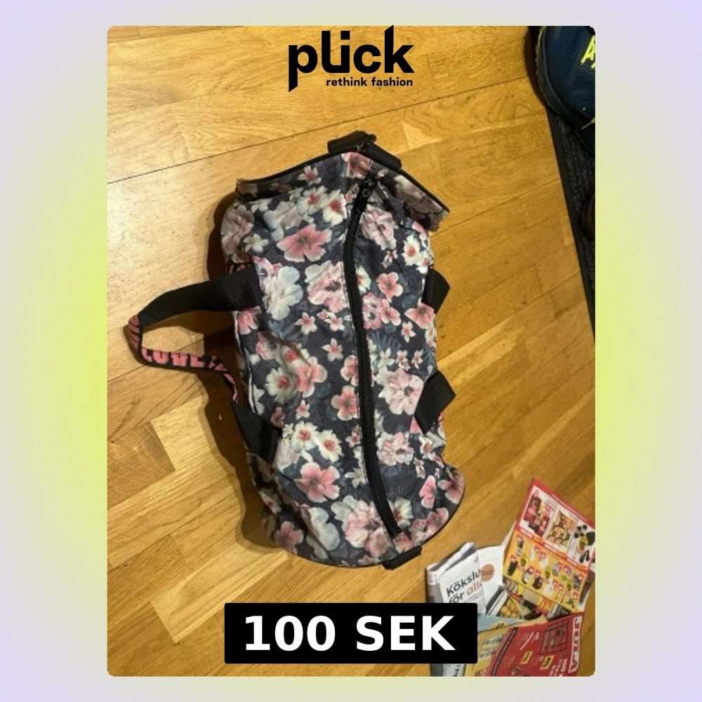 Säljer en blommig träningsväska i polyester med rosa, vita och ljusblå blommor på mörk botten. Väskan har svarta handtag och axelrem samt coola rosa band med soprtig –LOVE– text. Perfekt storlek för gymmet eller träningen och stängs med dragkedja.