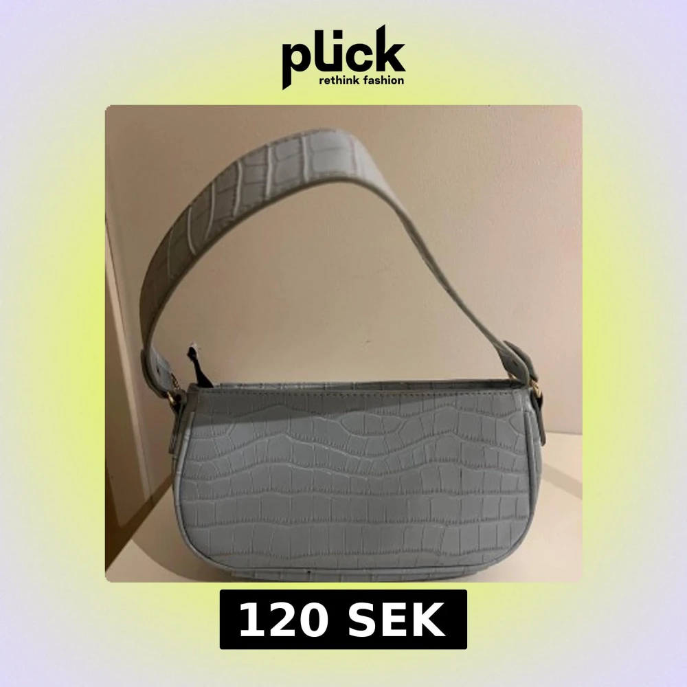 Säljer en ljusblå axelväska med crocopräglat mönster och bred axelrem. Väskan har guldfärgade detaljer och stängs med dragkedja. Perfekt storlek för det viktigaste och ger en trendig touch till din outfit.