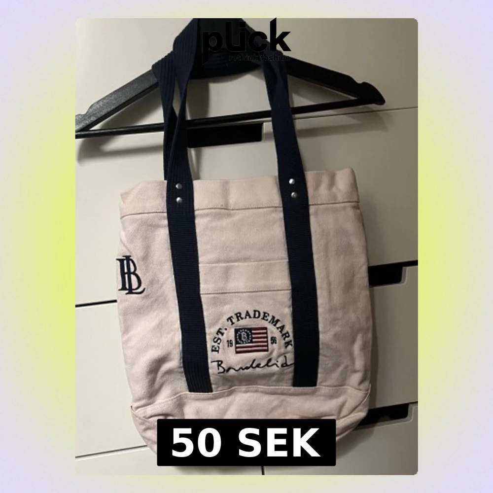 Säljer en ljusrosa shoppingväska från Bondelid med mörkblå handtag och innerfoder. Väskan har broderad Bondelid-logga och amerikansk flagga på framsidan, samt en praktisk innerficka med dragkedja. Perfekt storlek för att bära med sig allt man behöver.