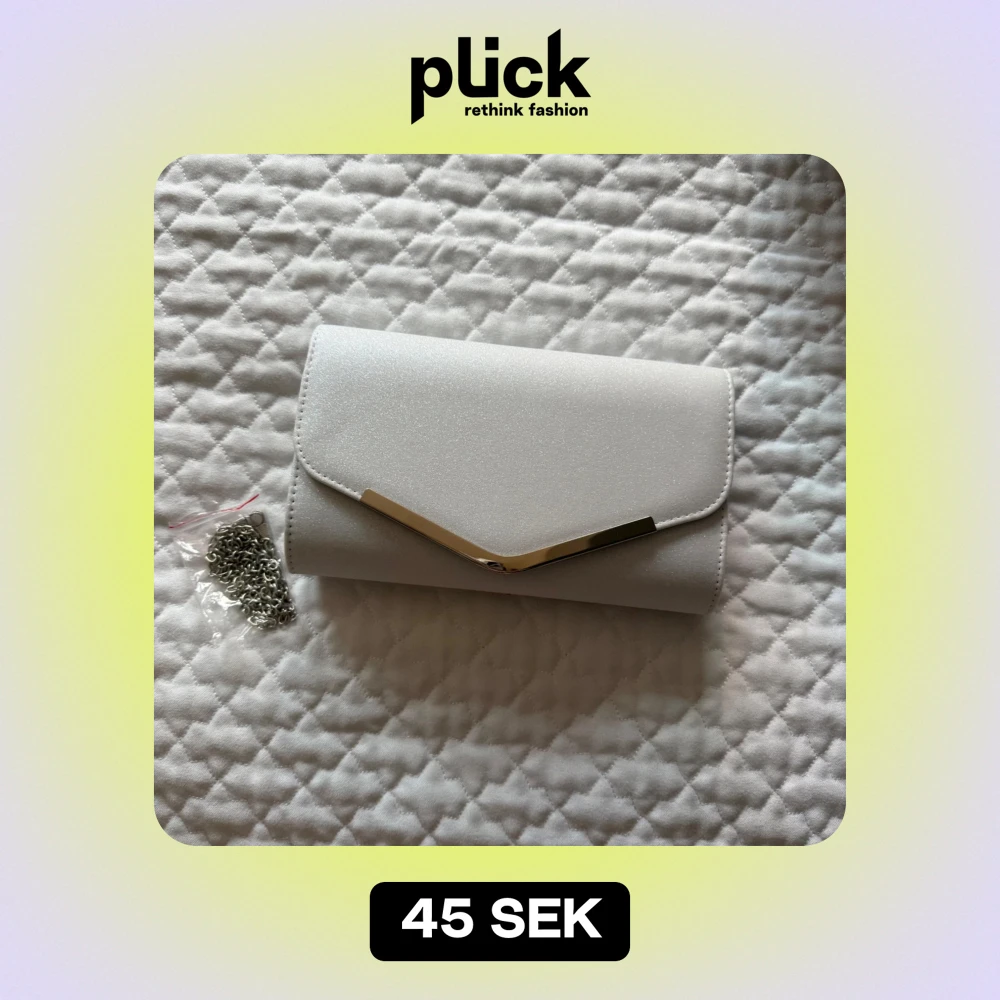 Säljer en vit kuvertväska med en silverdetalj på framsidan. Väskan har en avtagbar kedja. Den är i mycket bra skick och har aldrig använts.