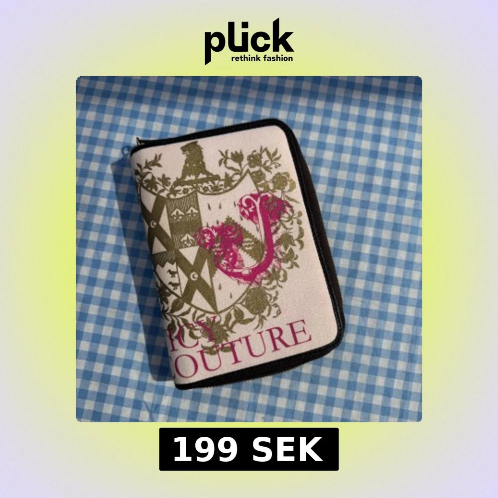 Snygg plånbok från Juicy Couture med ljusbeige tyg, grönt och rosa tryck i form av hjärta och emblem. Bruna kanter och dragkedja runt om. Insidan har fack för kort, guldiga detaljer och pennhållare. Perfekt för dig som gillar unika accessoarer.pennan funkar inte!
