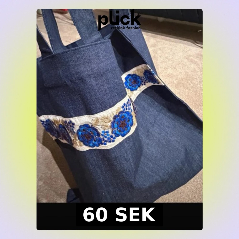 Unik shoppingväska i mörkblå denim med breda axelband och ett dekorativt band med broderade blå blommor och gulddetaljer. Perfekt storlek för att bära böcker, laptop eller annat du behöver under dagen. Väskan har en enkel, stilren form och känns både trendig och personlig.