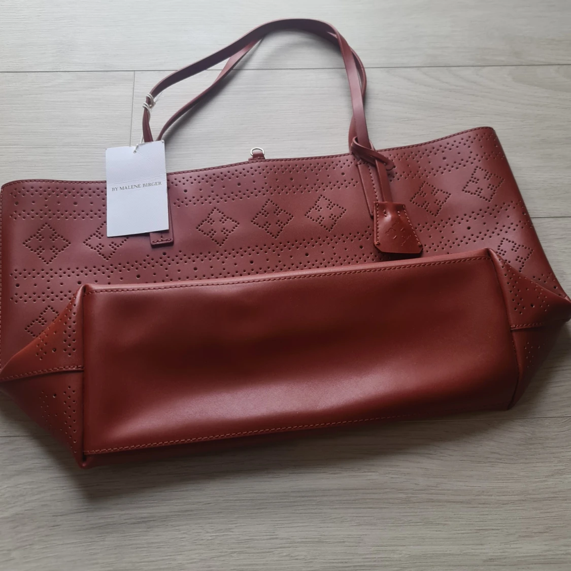 Snygg brun axelväska från By Malene Birger i skinn med laserutskurna geometriska mönster. Väskan har två smala axelremmar och en tag med logotyp. Perfekt storlek för att få plats med allt du behöver och stilren design som sticker ut.
