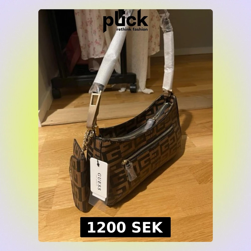 Snygg brun axelväska från Guess med stort G-mönster i svart och brunt. Väskan har guldfärgade detaljer, dragkedja upptill och en matchande liten plånbok på kedja. Tillverkad i syntetmaterial och har en bred axelrem.