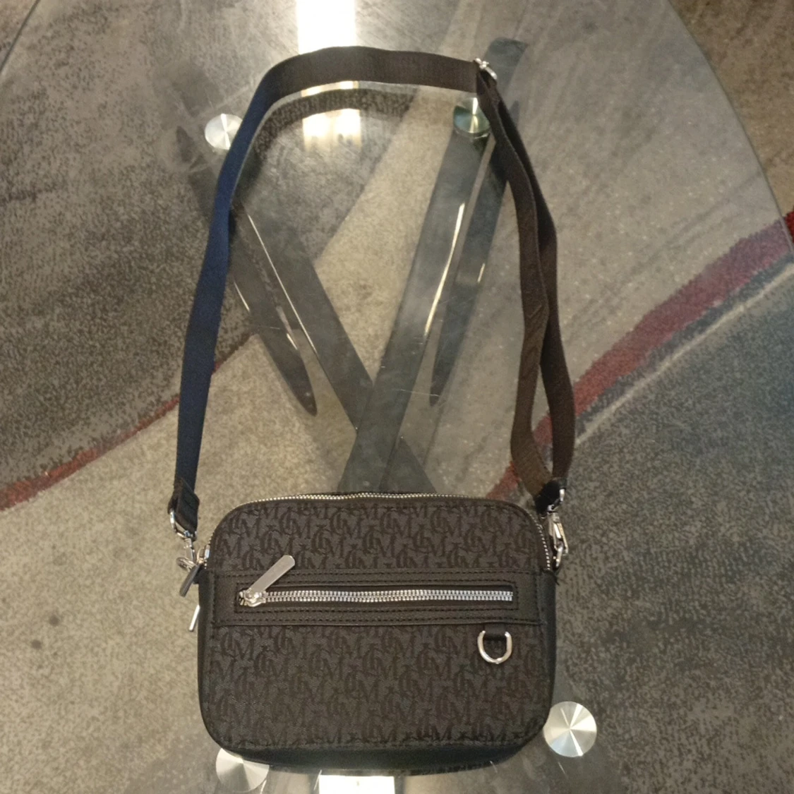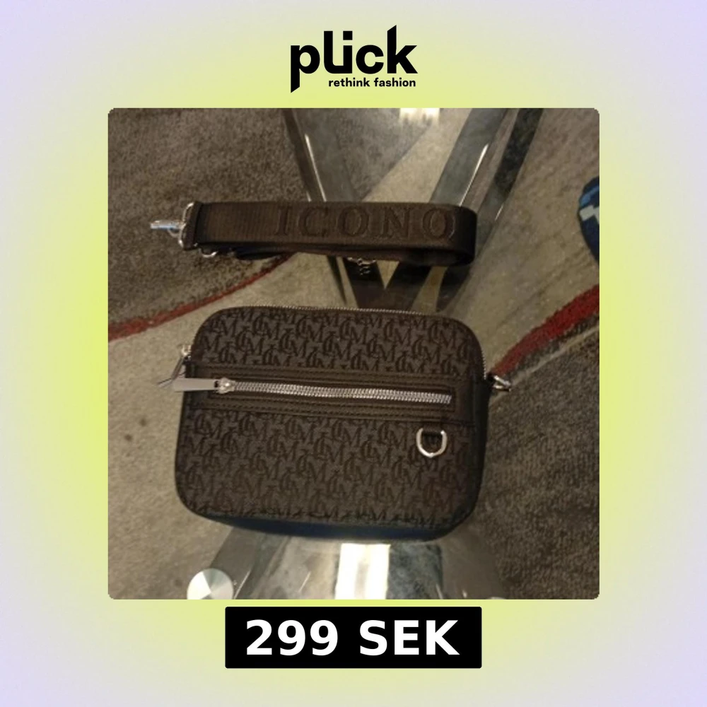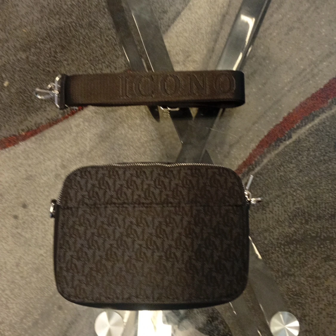 Snygg brun axelväska från Icono med präglat monogrammönster över hela väskan. Väskan har en bred axelrem med broderad logga, silverfärgade dragkedjor och detaljer samt en praktisk ytterficka framtill. Perfekt storlek för mobilen och andra essentials.