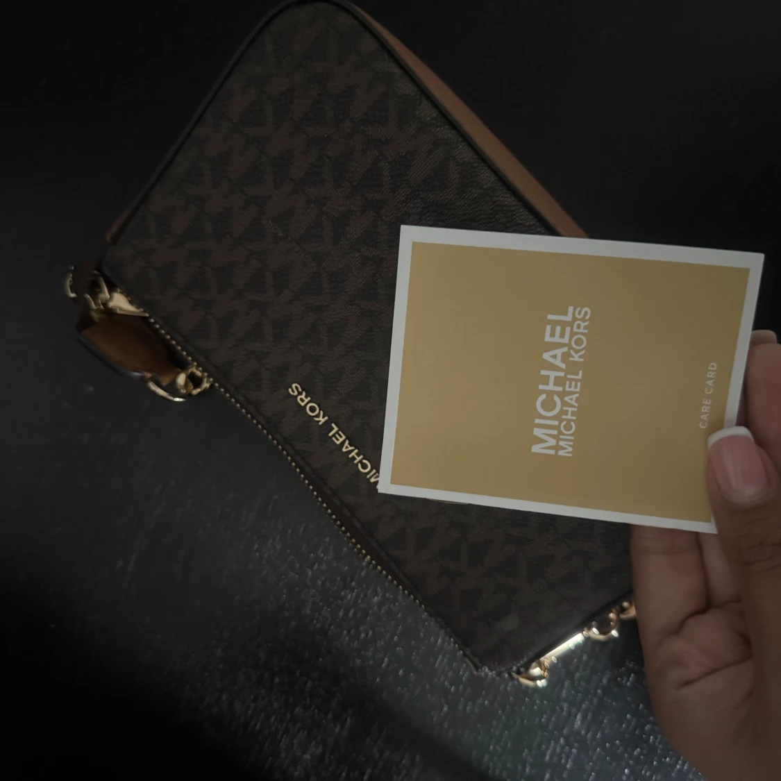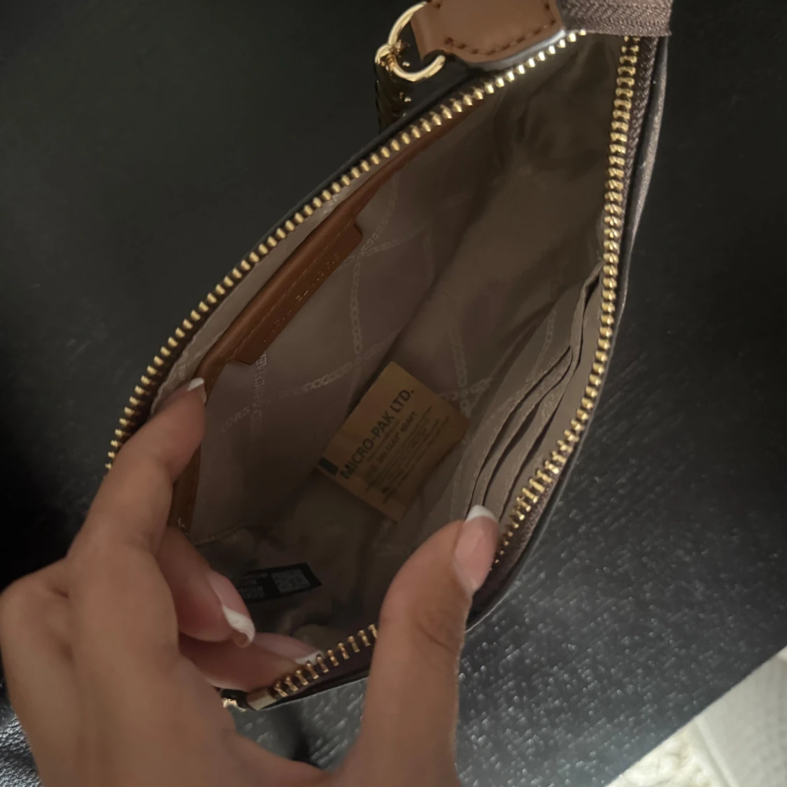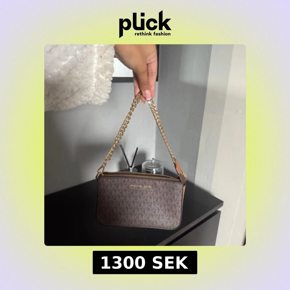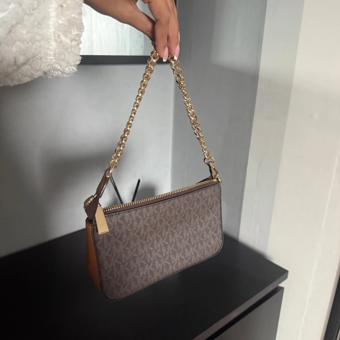 Snygg brun axelväska från Michael Kors med kedjehandtag i guld och klassiskt MK-mönster. Väskan har dragkedja upptill och flera fack inuti för kort och småsaker. Perfekt storlek för det viktigaste och en stilren detalj till din outfit.