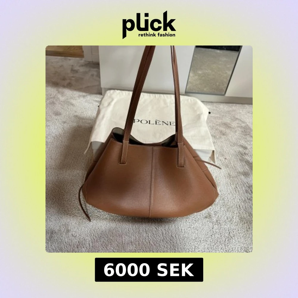 Snygg och rymlig brun axelväska från Polène i slätt skinn med stilrena linjer och långa axelremmar. Väskan har en mjuk, rundad form och medföljande matchande necessär. Väskan har används några enstaka gånger så den är sparsamt använt och i gott skick.