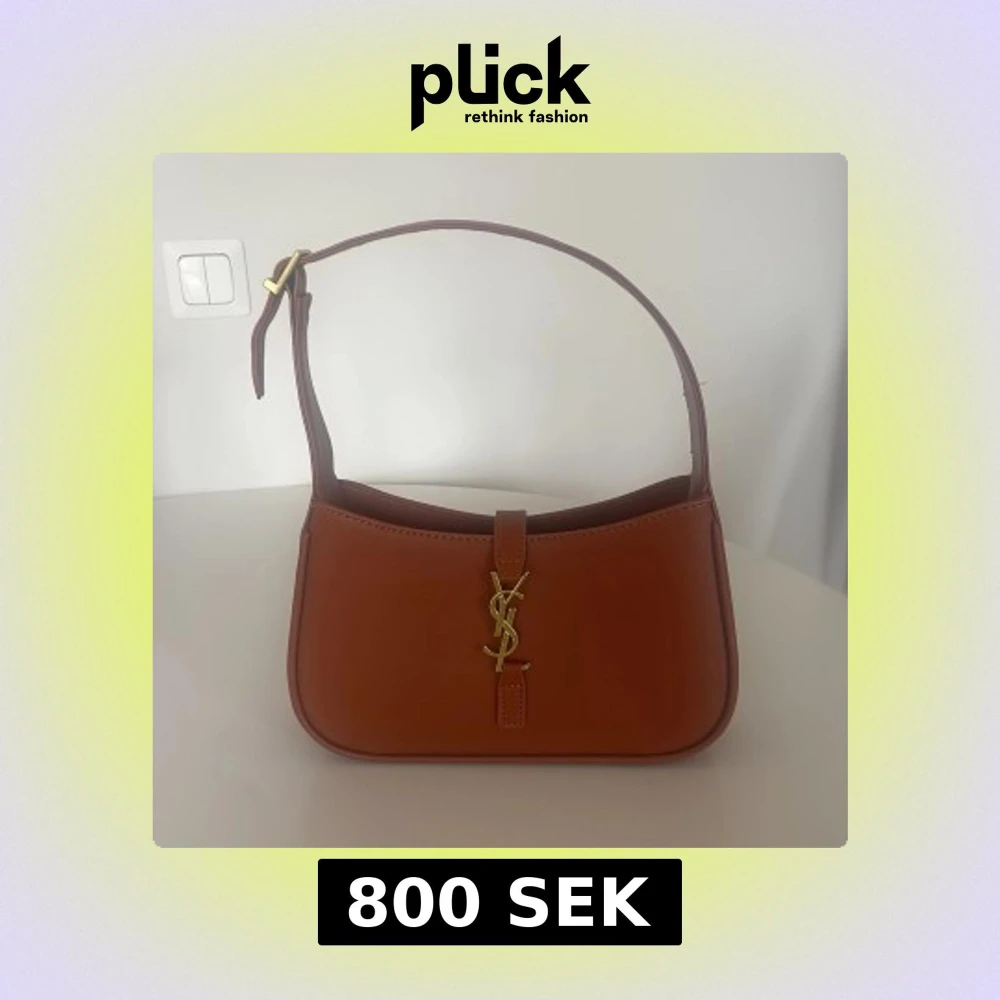 Snygg brun axelväska från Yves Saint Laurent i slätt skinn med guldigt YSL-logo framtill. Väskan har justerbart axelband och stilren, avlång form.