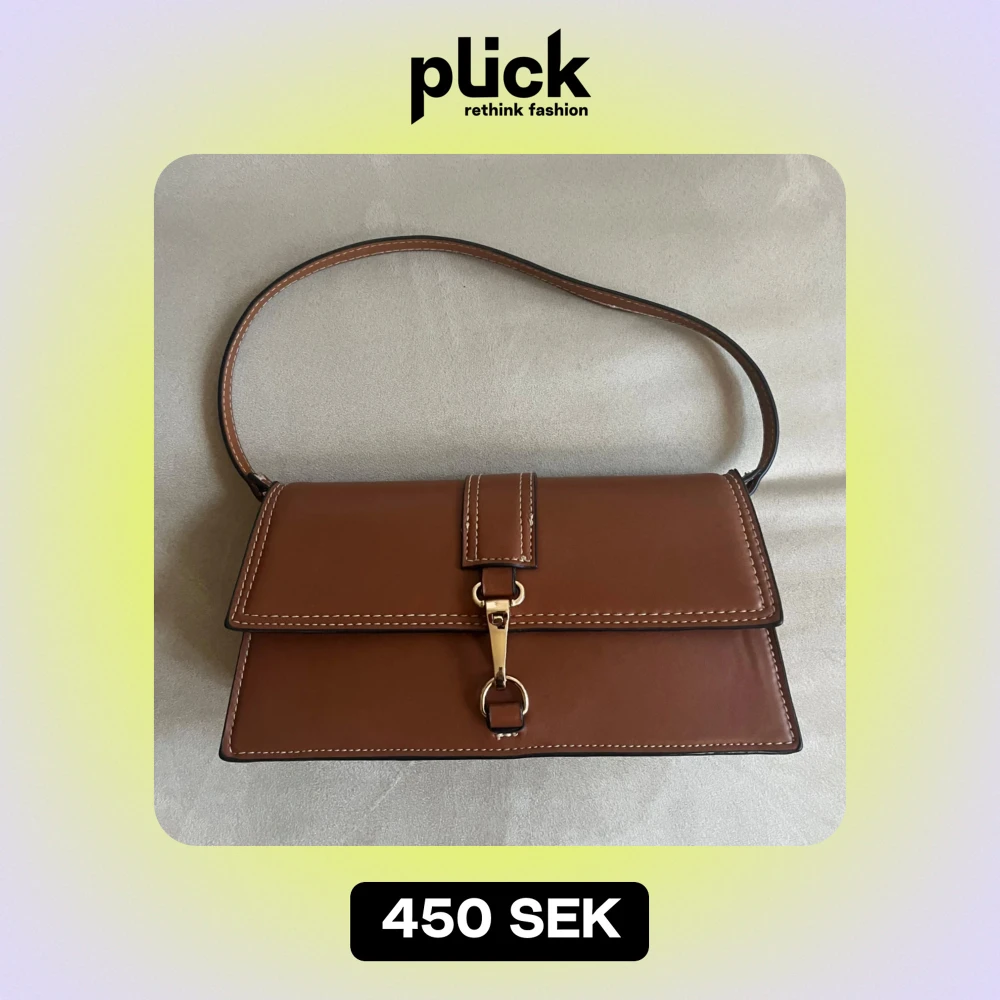 Snygg brun axelväska i skinn med stilren design. Väskan har en elegant gulddetalj på framsidan och en praktisk axelrem. Perfekt för både vardag och fest! Inköpt på Mango förra året i Los Angeles. I nyskick.