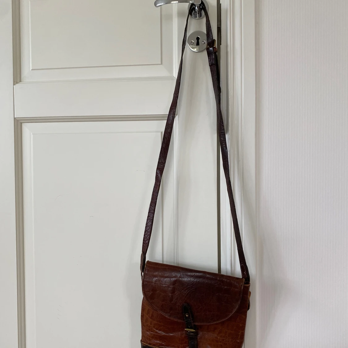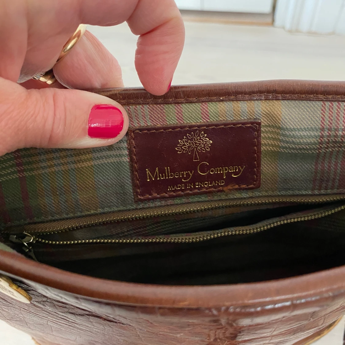 Snygg brun axelväska från Mulberry i croco präglat skinn. Väskan har ett klassiskt spänne framtill, justerbar axelrem och insida i rutigt tyg. Perfekt för dig som gillar vintagevibbar och tidlös design. Väl använd men inga större defekter eller hål eftersom att den har använts skicklig. Priset är absolut diskuterbart!