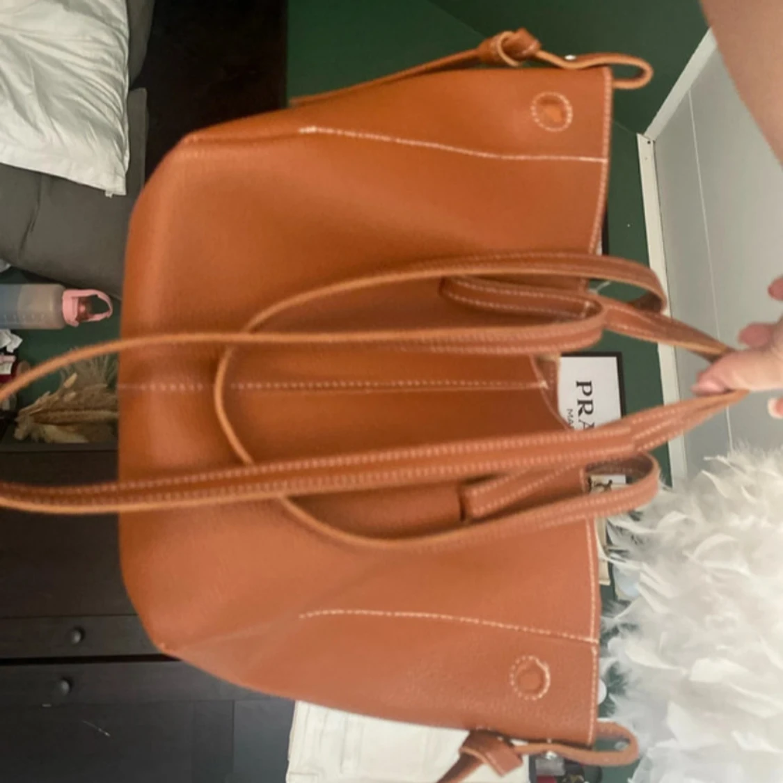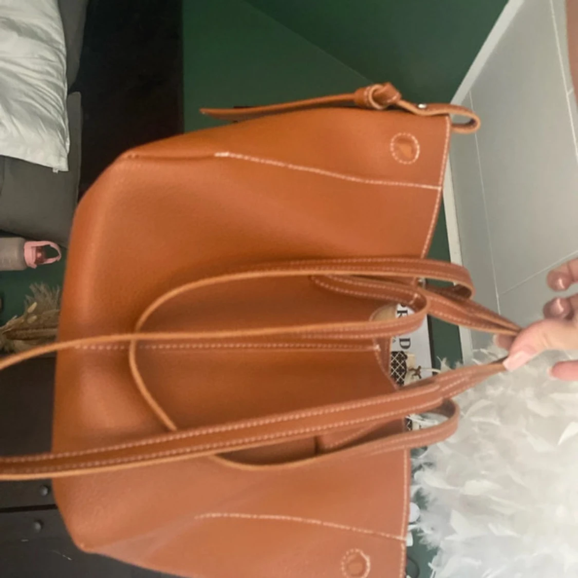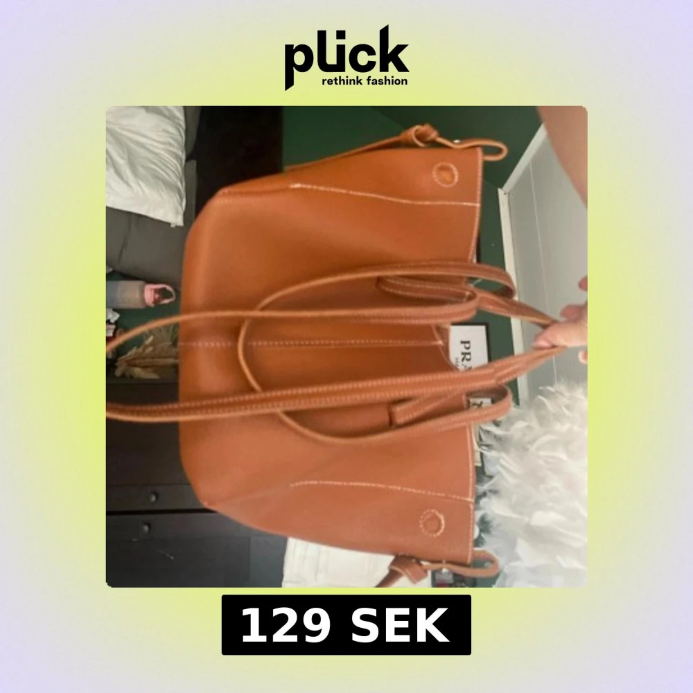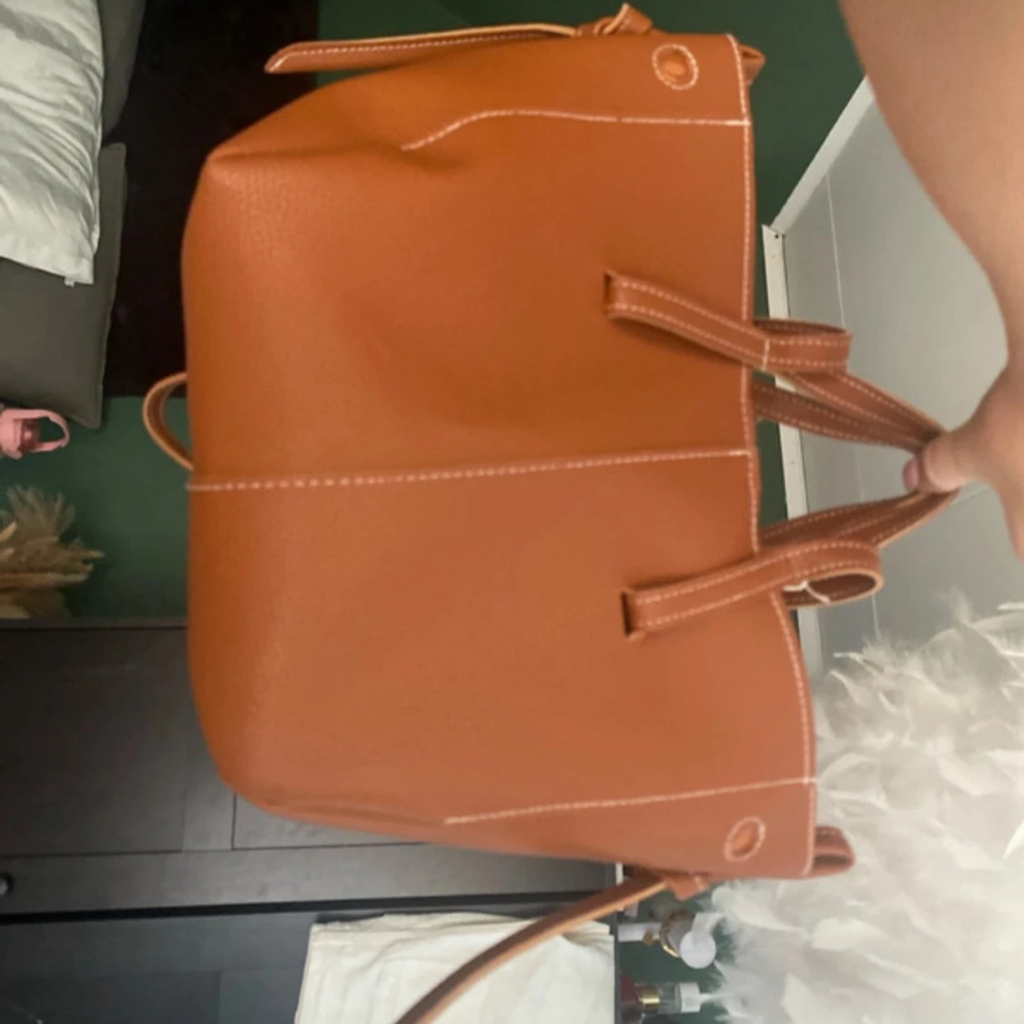 Säljer en stilren brun axelväska i skinn med vita kontrastsömmar och dubbla handtag. Väskan har en rymlig design och är perfekt för dig som vill ha plats för allt du behöver under dagen. Enkel och snygg look som passar till många outfits. den har små skavanker i cirklarna på väskan som syns på bilderna men inget man märker alls, även en lös tråd men det påverkar inte funktionen då jag fått de fixat med textillim.