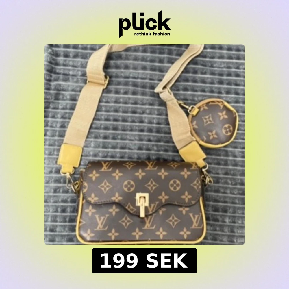 Snygg brun axelväska med klassiskt monogrammönster och beige detaljer. Väskan har en bred justerbar axelrem, guldkedja och en liten rund coin pouch som hänger på sidan. Perfekt för dig som gillar lyxiga accessoarer med ikonisk design.
