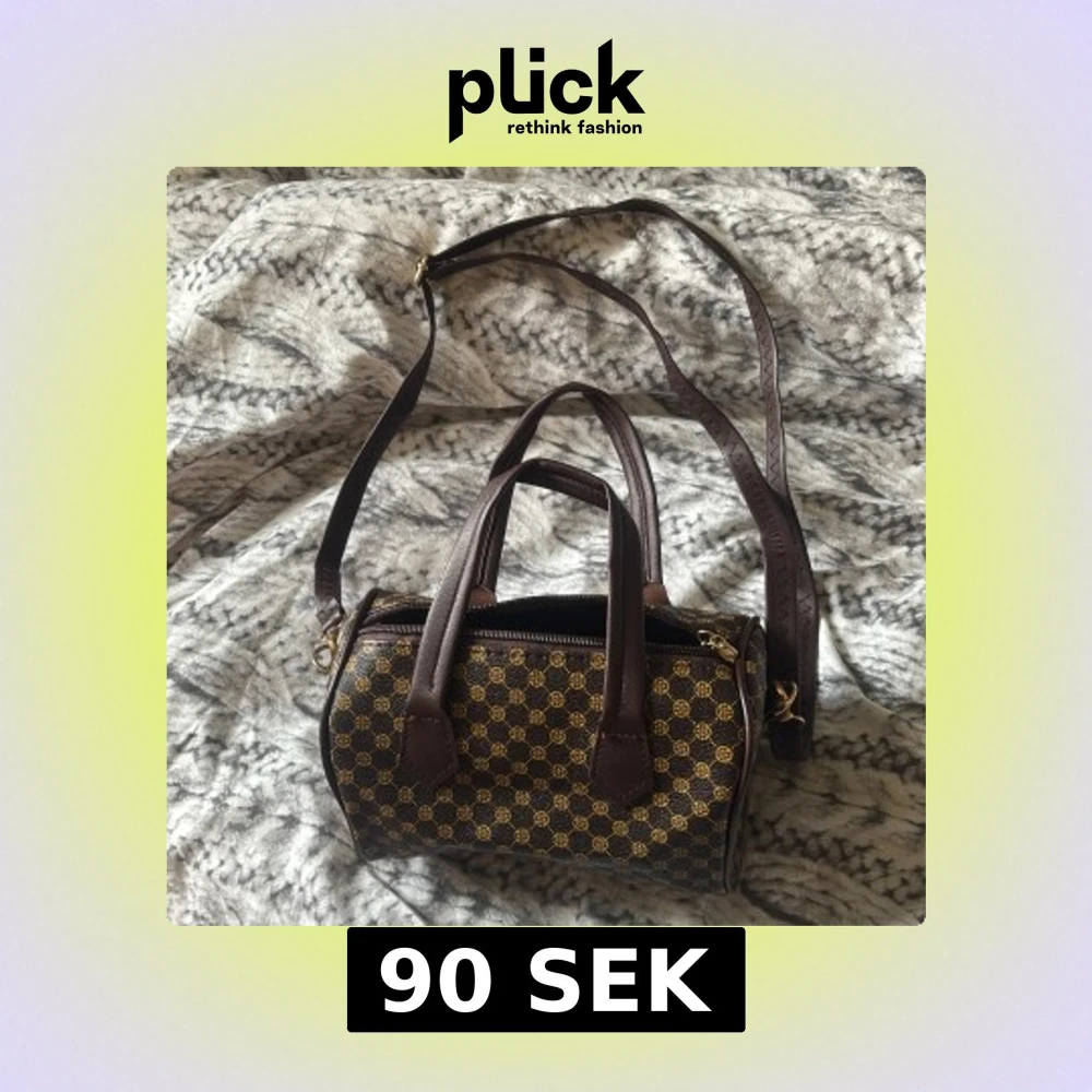 Snygg brun axelväska med klassiskt mönster i gult och brunt. Väskan har både handtag och justerbar axelrem samt dragkedja upptill. Perfekt storlek för vardagens essentials och ger en lyxig känsla med sina guldfärgade detaljer.