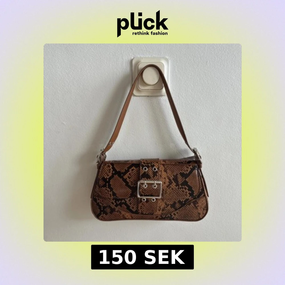 Snygg axelväska från H&M i brunt ormmönstrat syntetmaterial. Väskan har ett brett axelband, silverfärgat spänne framtill och magnetlås. Insidan är fodrad i beige och har en innerficka. Perfekt för att lyfta din outfit. Helt ny med pris lapp! Nypris: 299kr