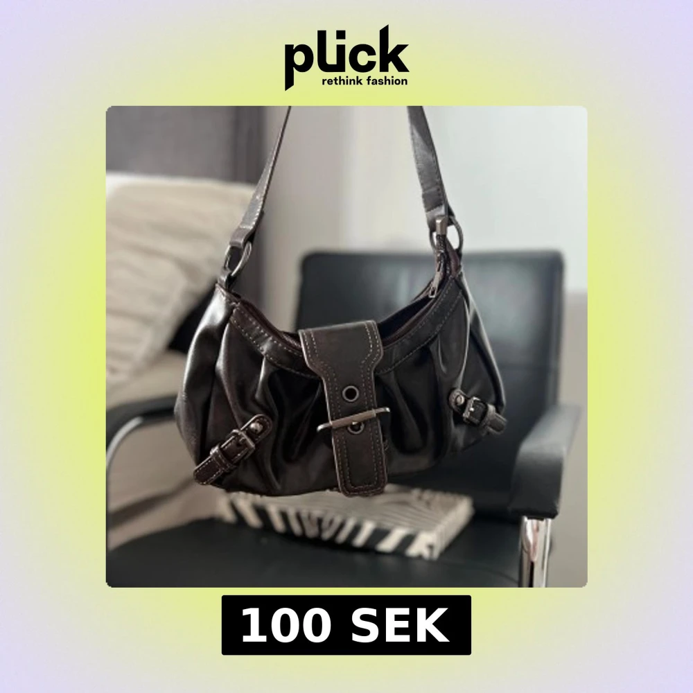 Snygg brun axelväska i skinn med dekorativa spännen och kontrastsömmar. Väskan har en justerbar axelrem och en praktisk dragkedja för säker förvaring. Perfekt för att ge din outfit en stilfull touch.
