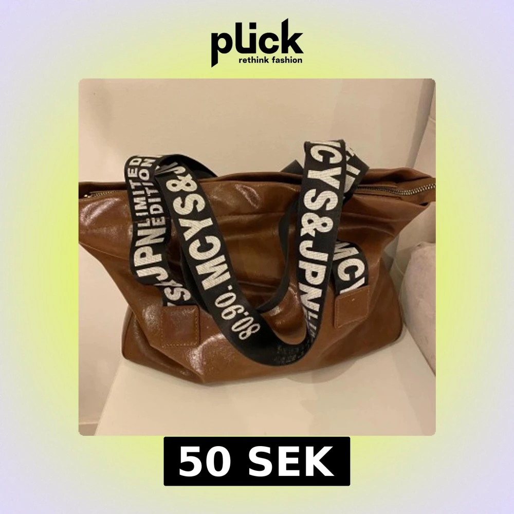 Snygg brun axelväska i syntetmaterial med breda svarta axelband som har vit text. Väskan har en praktisk dragkedja upptill och en rymlig design, perfekt för vardagsbruk.