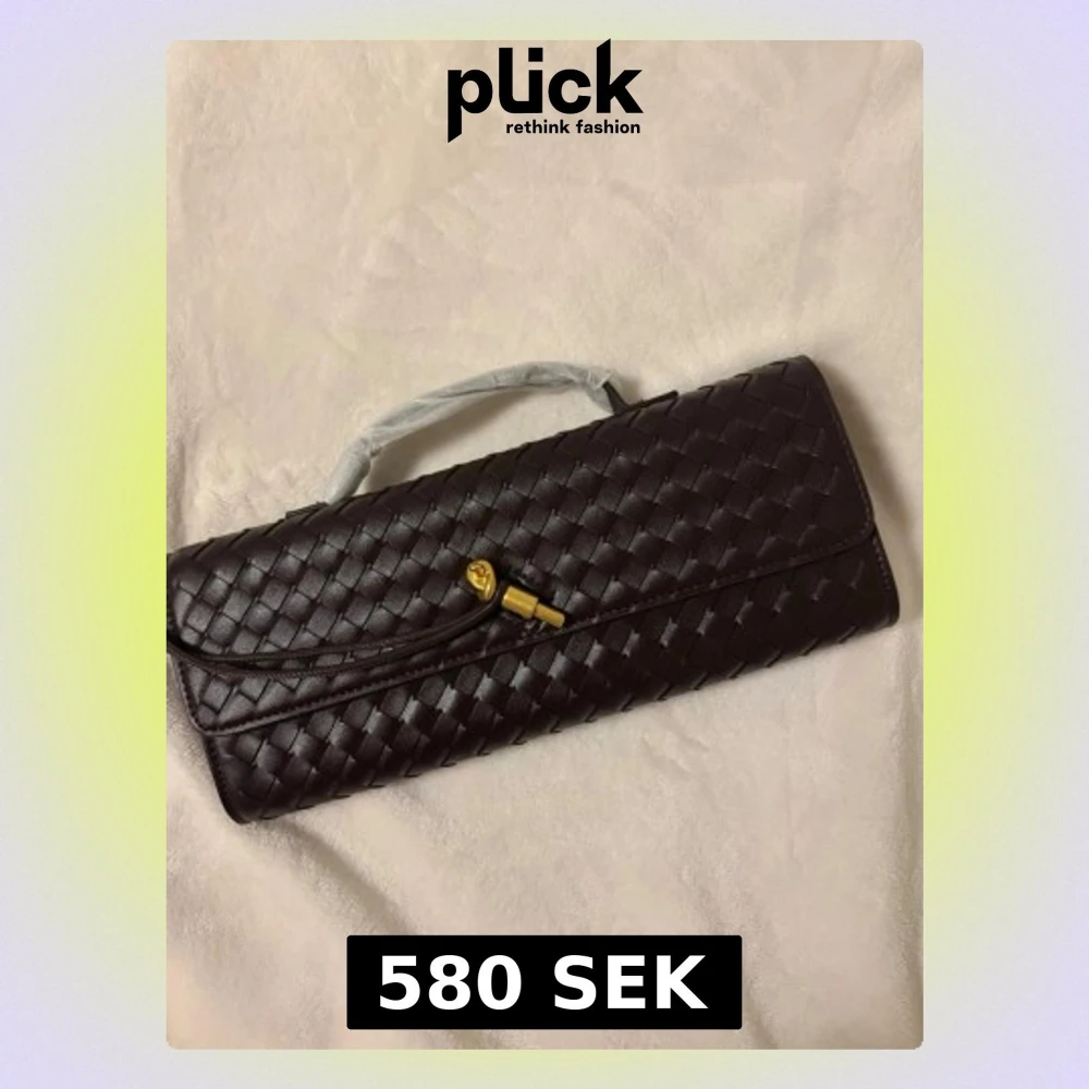 Snygg mörkbrun kuvertvÀska i flÀtat skinn med guldfÀrgad detalj pÄ framsidan. AvlÄng och stilren design. Kan bÀras bÄde som en clutch och som en axelvÀska (band följer med)
