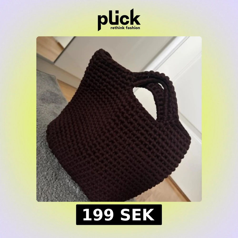 Unik brun handväska med grovstickad design och integrerade handtag. Väskan har en fyrkantig form och är tillverkad i mjukt stickat material som ger en cool och chunky vibe. Perfekt för dig som gillar personliga accessoarer med lite extra karaktär.