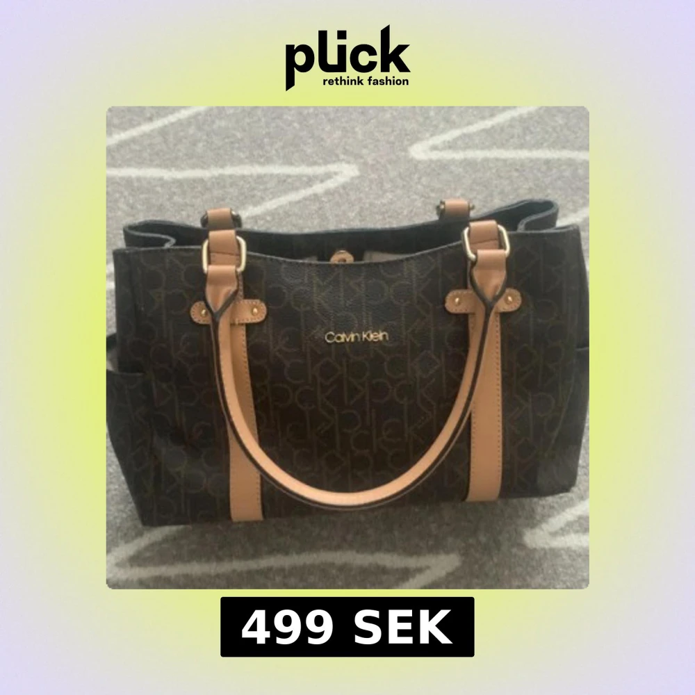 Snygg handväska från Calvin Klein i mörkbrunt med beige detaljer och logomönster över hela väskan. Väskan har två rejäla handtag, flera fack och dragkedja baktill. Insidan är fodrad med CK-mönster och har extra fickor för småsaker. Perfekt för dig som gillar stilren design.
