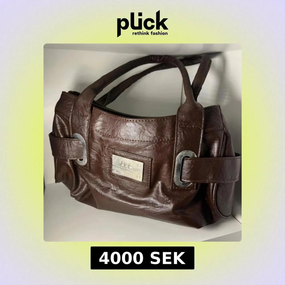 Snygg brun handväska från D&G i mjukt skinn med metallplatta framtill och coola detaljer på sidorna. Väskan har två rejäla handtag och en stilren, klassisk form som passar till många outfits. Perfekt för dig som gillar designer och vill sticka ut med vintage stilen.