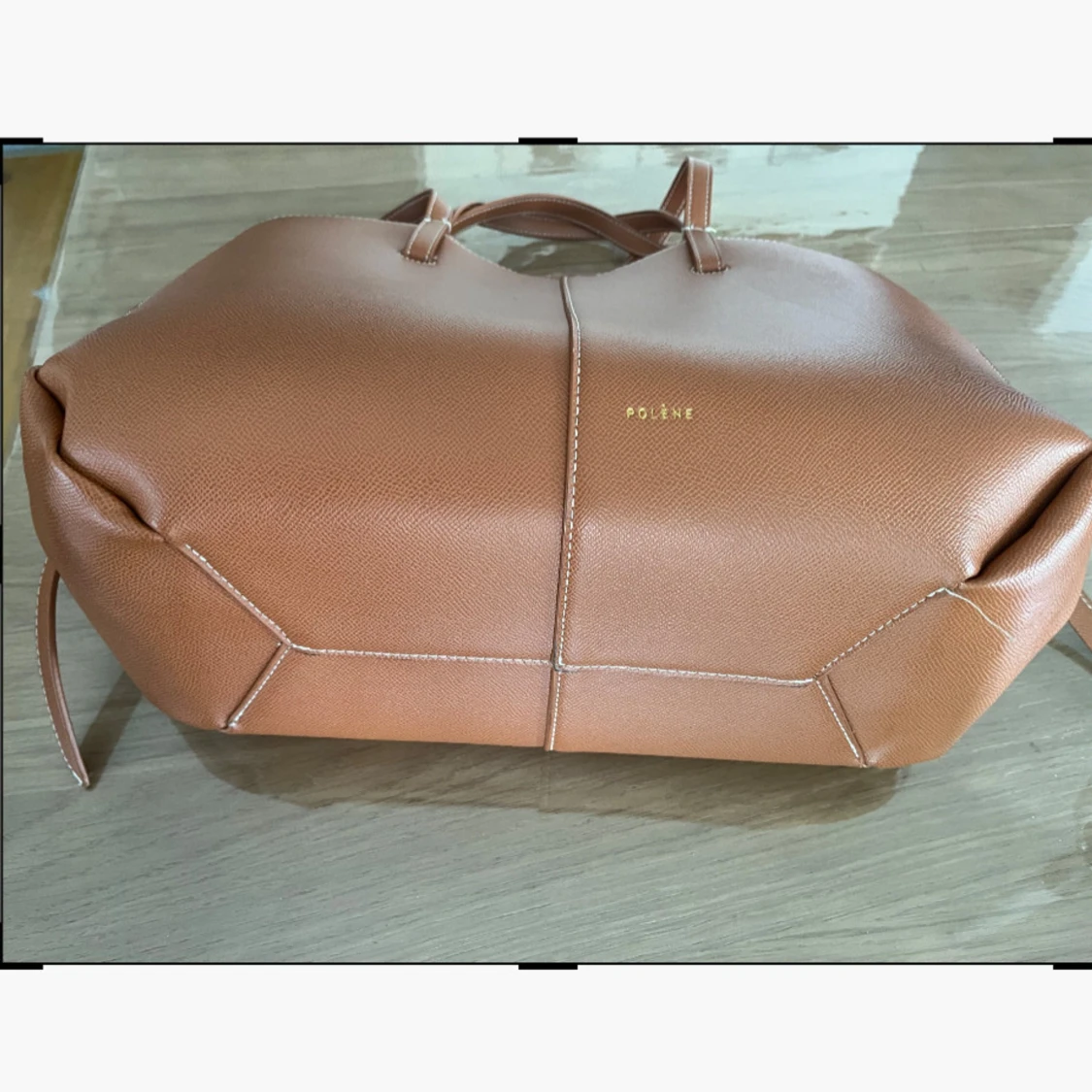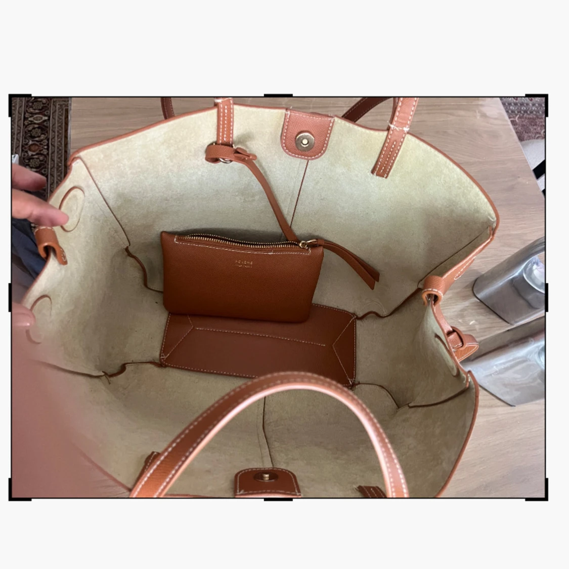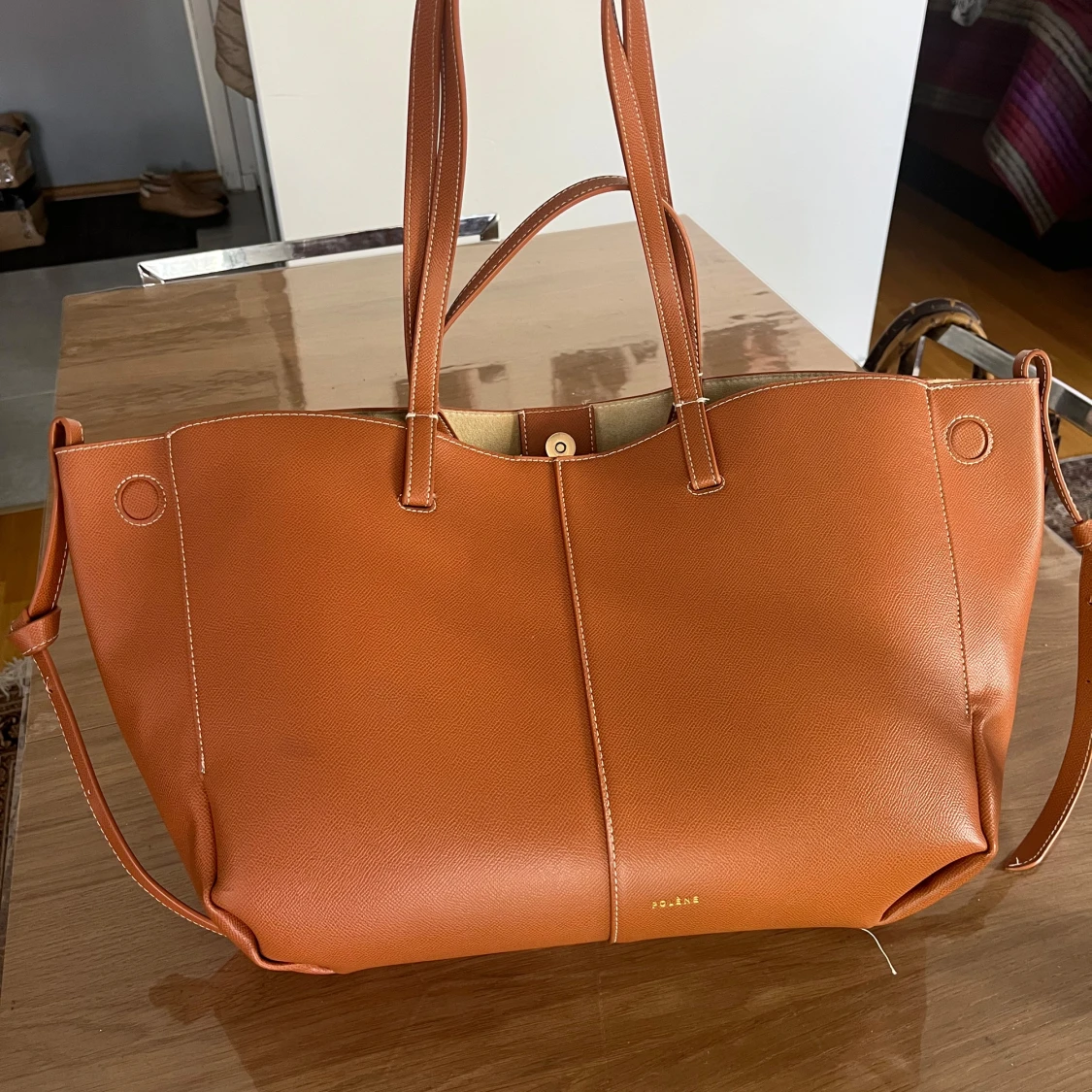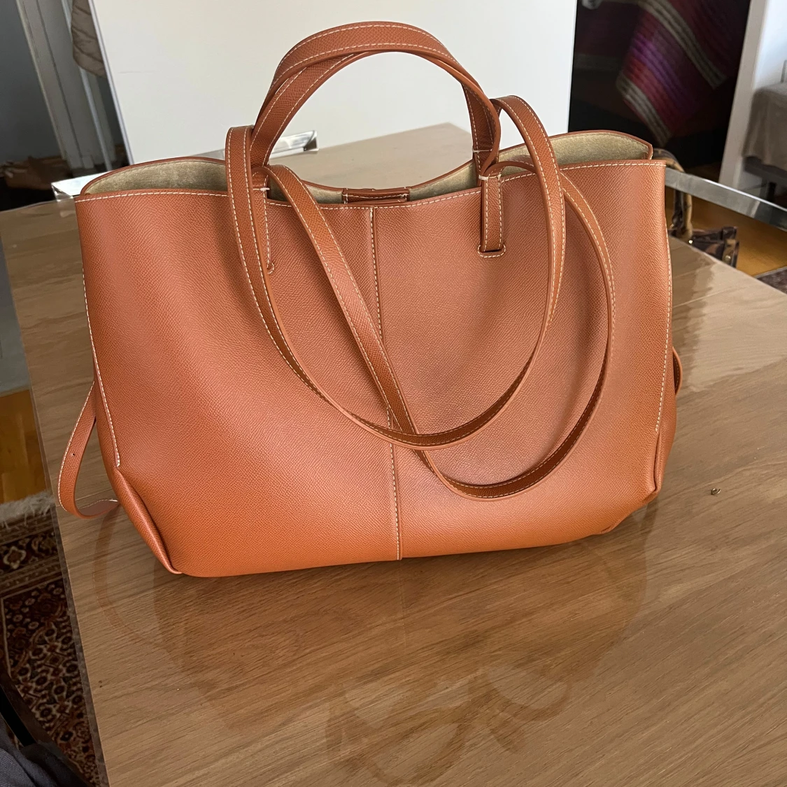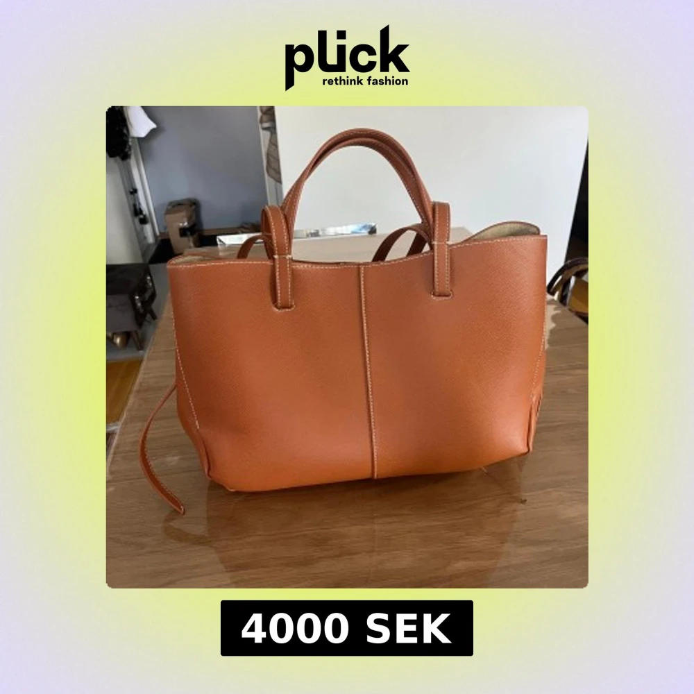 Jag köpte den från Plick. Väskan har en stilren design med ljus insida och guldtext på utsidan. Perfekt för dig som vill ha en rymlig och trendig accessoar. Ej äkta