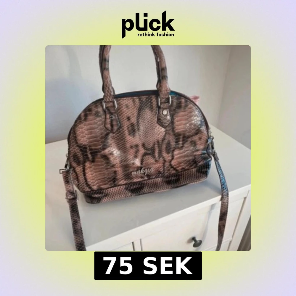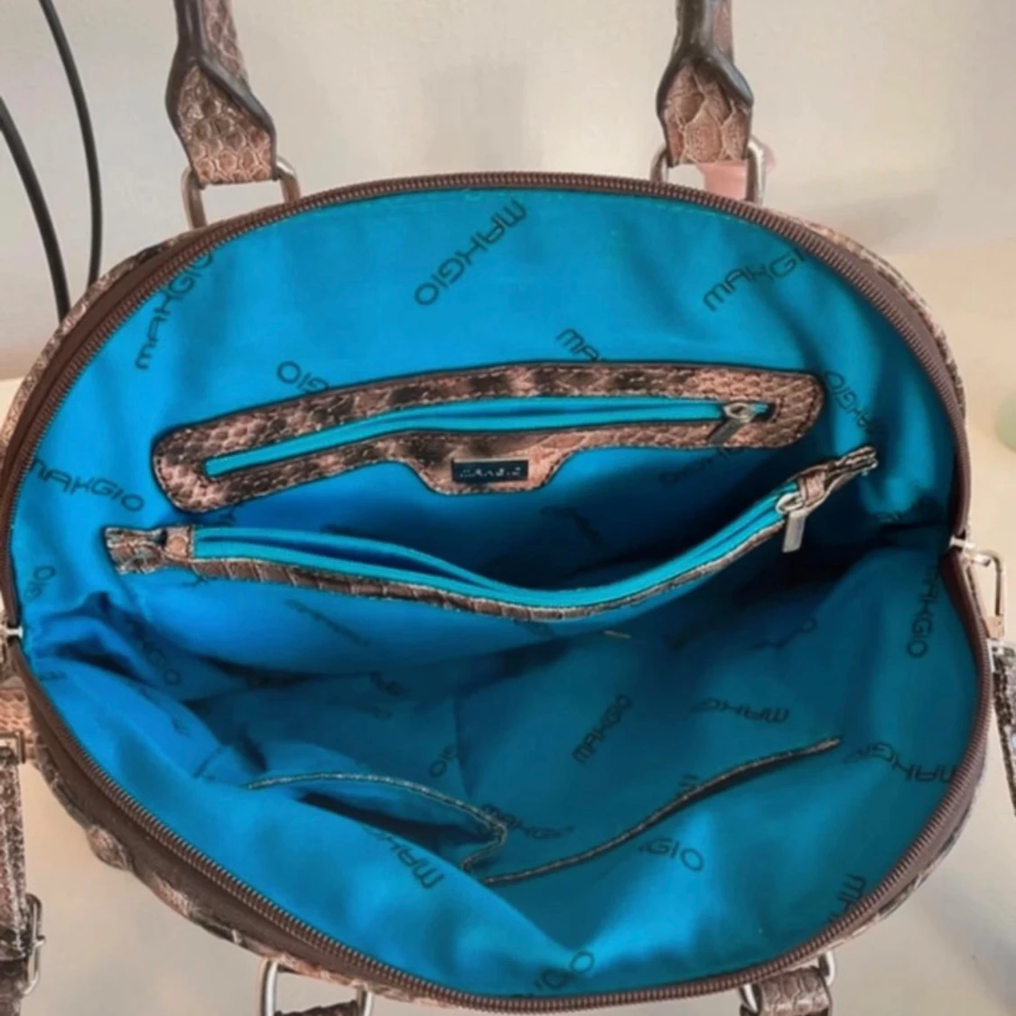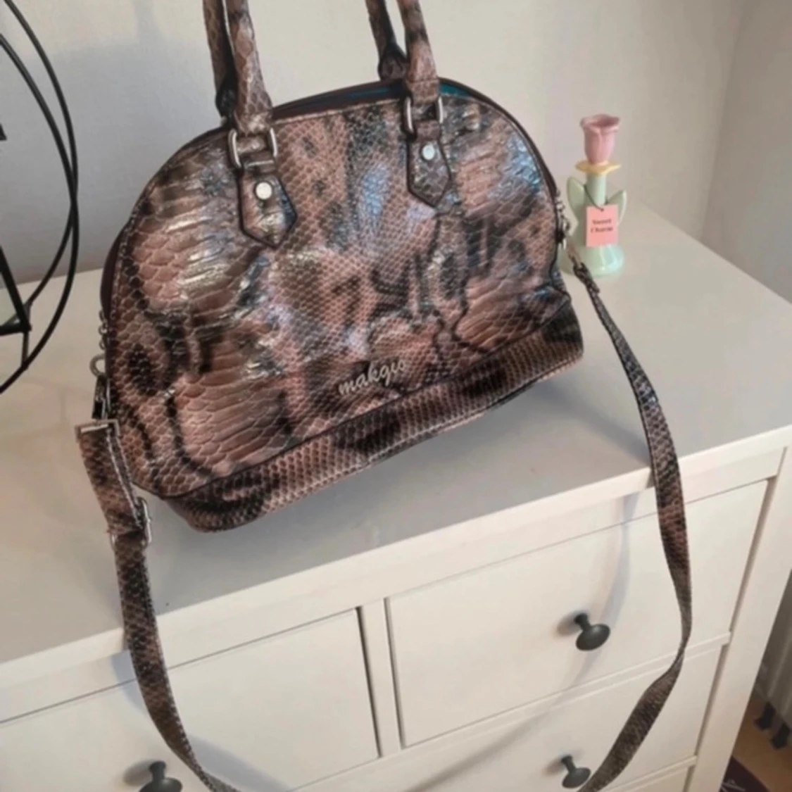 Snygg handväska från Makgio i brunt ormmönstrat material med både handtag och axelrem. Väskan har rundad form, dragkedja upptill och insida i klarblått tyg med flera fack. Perfekt för dig som vill sticka ut med en unik accessoar.