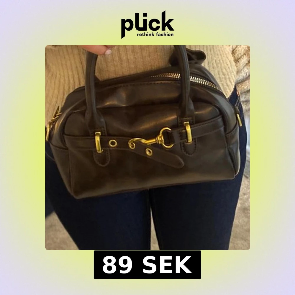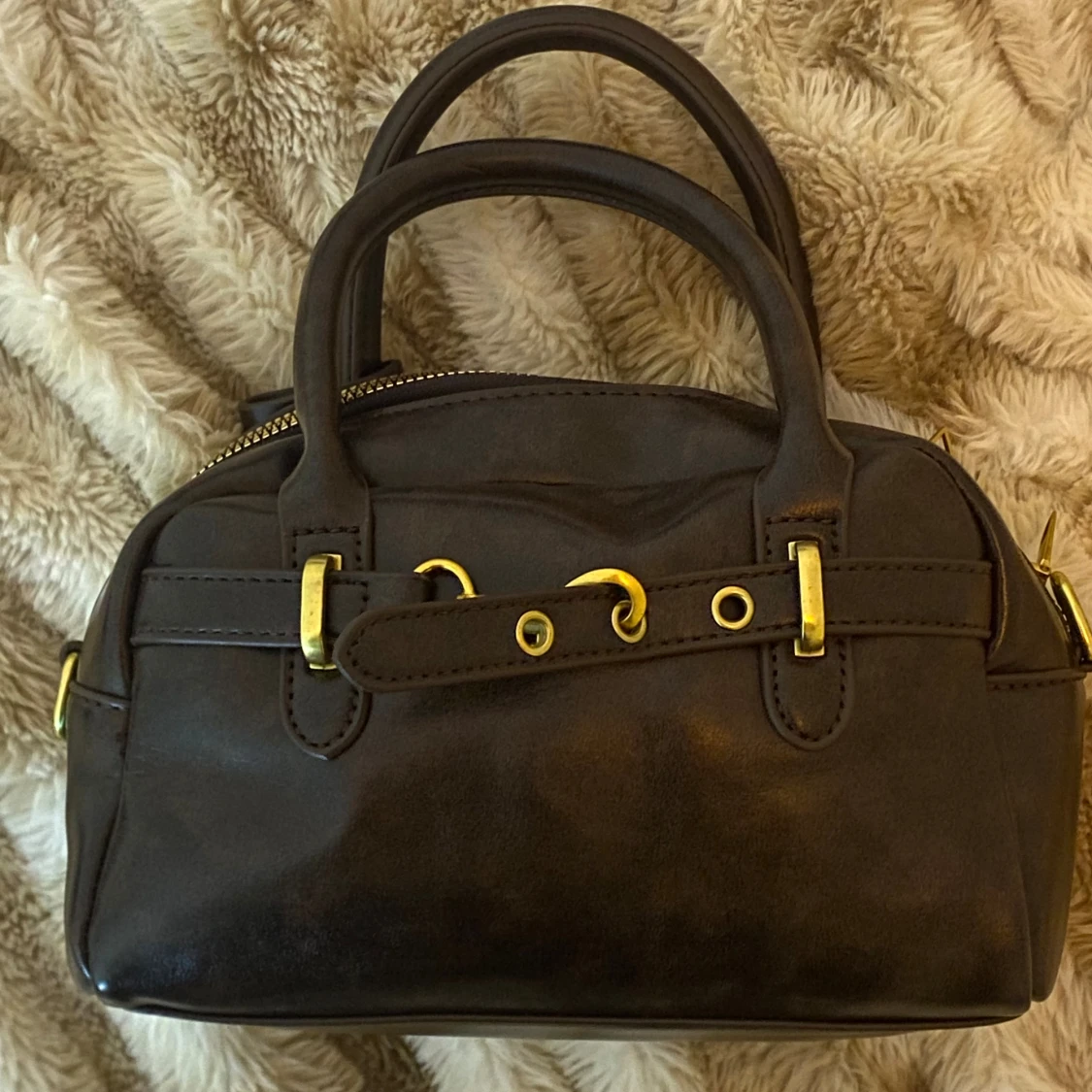 Snygg brun handväska i skinn med guldfärgade metalldetaljer och dragkedja. Väskan har två handtag och avtagbar axelrem, samt dekorativt spänne framtill. Kompakt och stilren modell som ger en lyxig känsla.