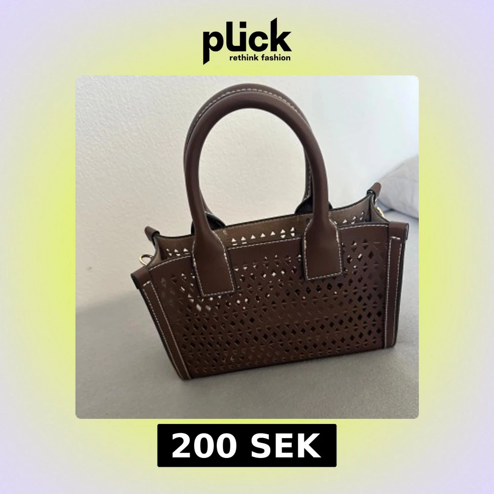 Snygg brun handväska i skinn med coolt utskuret mönster och vita kontrastsömmar. Väskan har både handtag och en avtagbar axelrem i matchande färg med gulddetaljer. Perfekt storlek för det viktigaste och ger en trendig touch till din outfit.