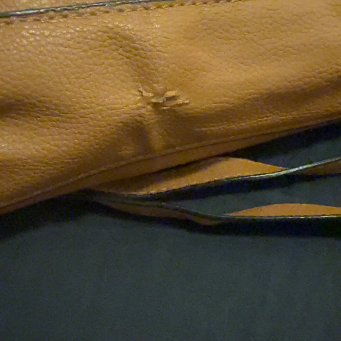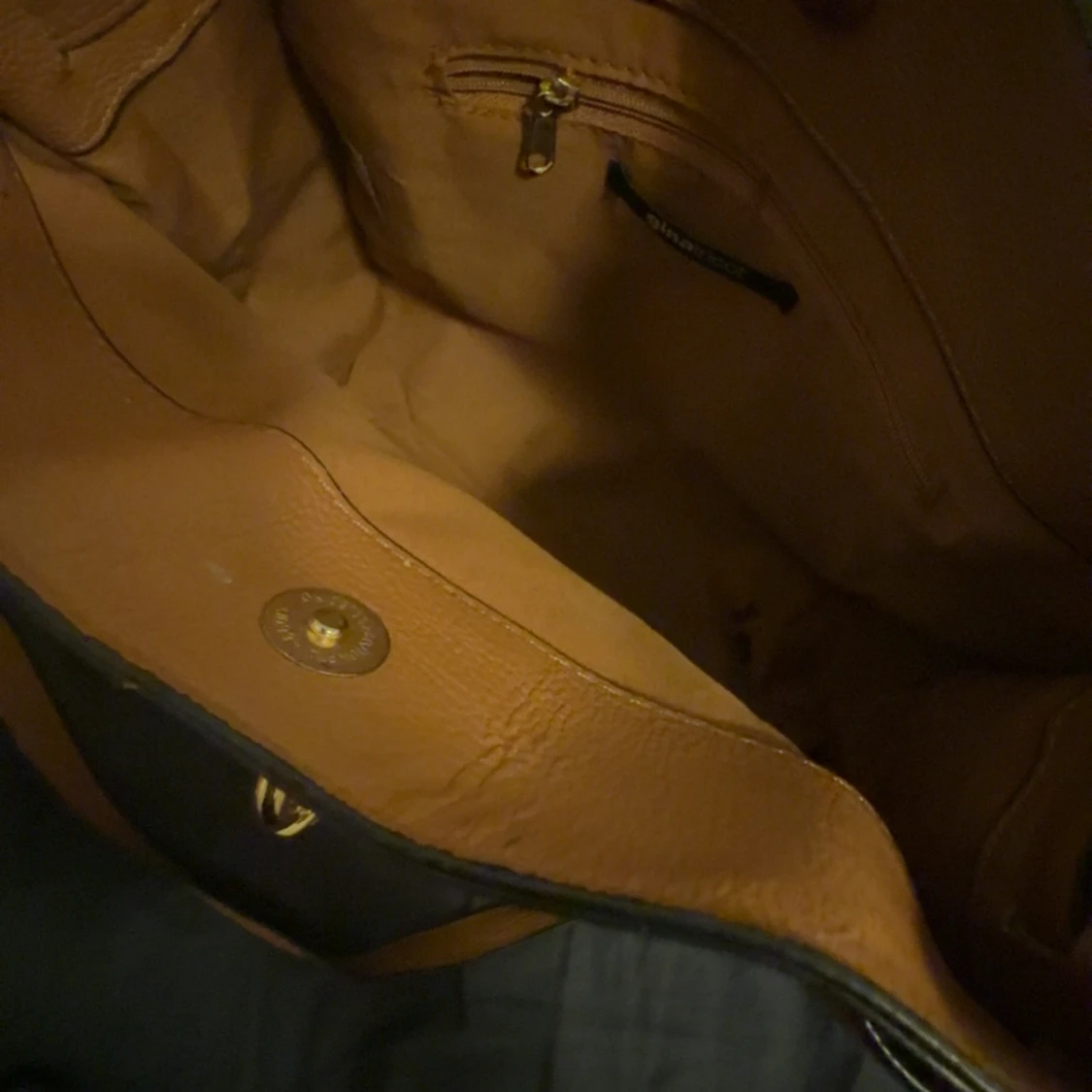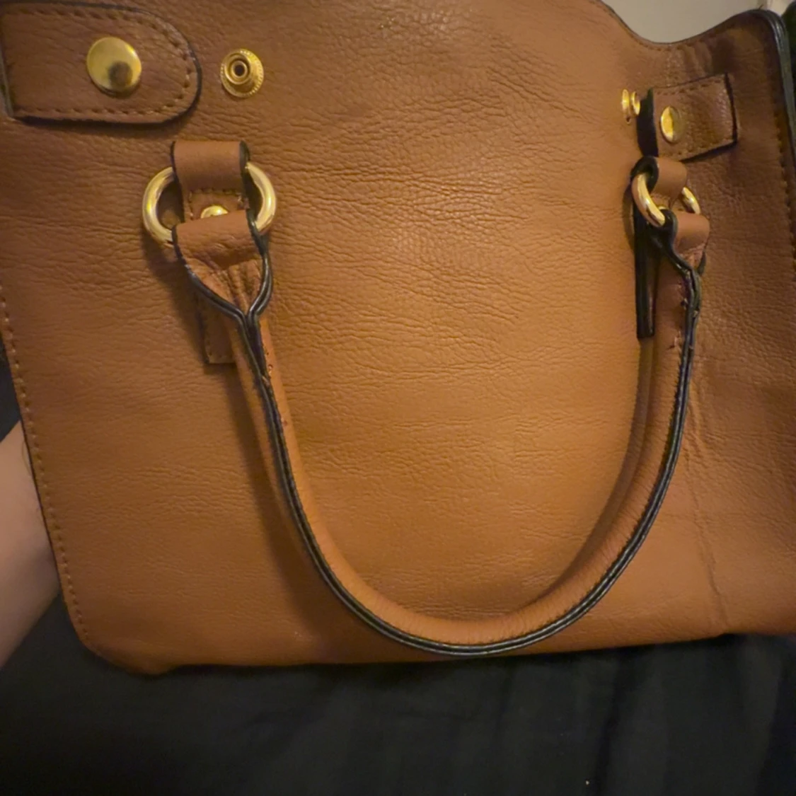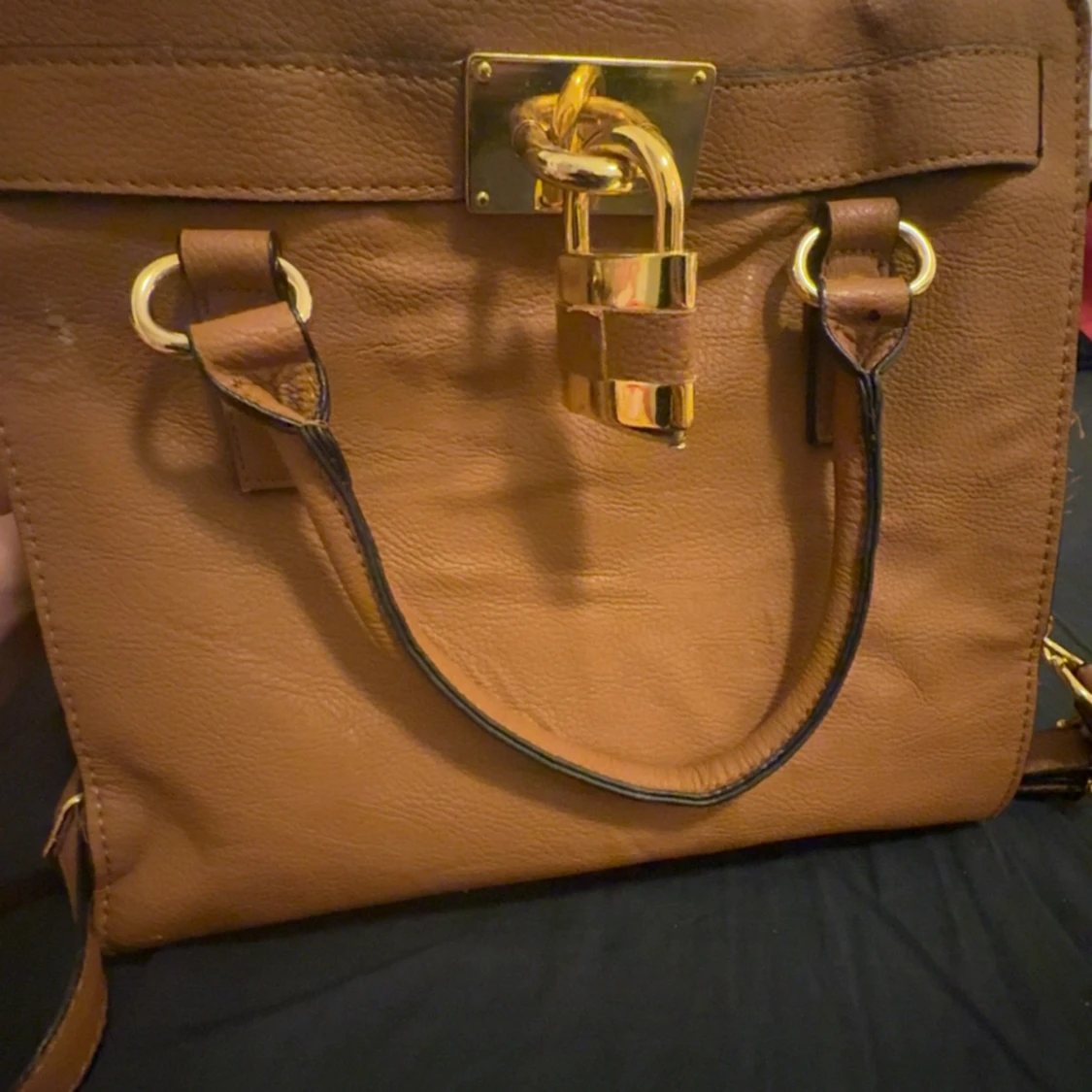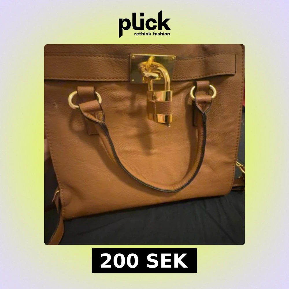 Snygg brun handväska i skinn med guldfärgade metalldetaljer och lås framtill. Väskan har två handtag, innerfack med dragkedja och magnetknäppning. Perfekt storlek för att få plats med allt du behöver. Dock så lade jag märket till att skinnet börjar lossna lite längst ner på väskan men de är inget som påverkar användningen.