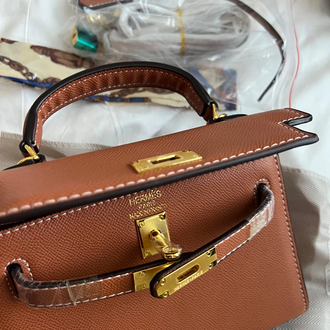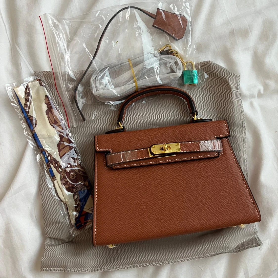 Säljer en brun Kelly likande handväska i lyxigt skinn med guldfärgade metalldetaljer och klassiskt lås. Väskan har ett topphandtag, avtagbar axelrem och vita kontrastsömmar. Kommer med dustbag, lås och scarf. Perfekt för dig som vill ha en ikonisk och elegant accessoar.