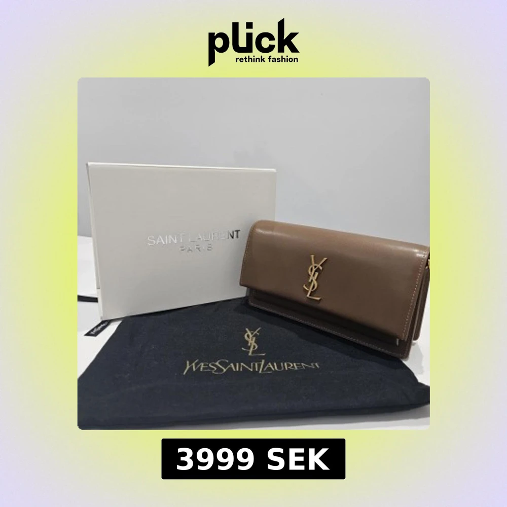 Säljer en lyxig brun kuvertväska från Saint Laurent med ikoniskt YSL-emblem i guld framtill. Väskan är i slätt skinn och har en guldfärgad kedja som axelrem. Insidan har flera fack och magnetlås. Perfekt för dig som vill ha en stilren och exklusiv accessoar.