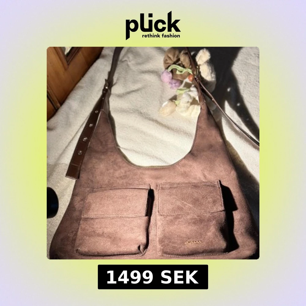 Snygg brun axelväska i mocka med två stora framfickor som stängs med magnetknapp. Väskan har justerbar axelrem i mörkbrunt skinn och en mjuk, slät yta. Perfekt för dig som gillar praktiska detaljer och stilren design.