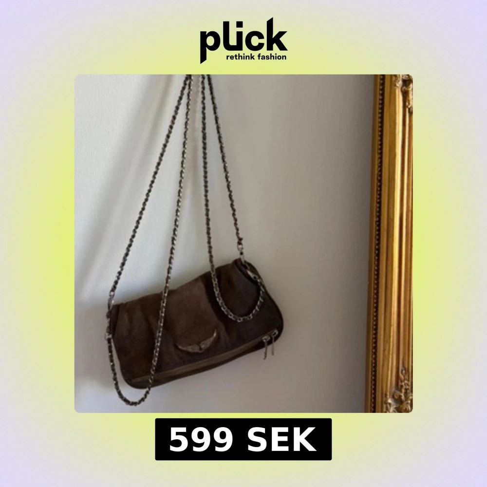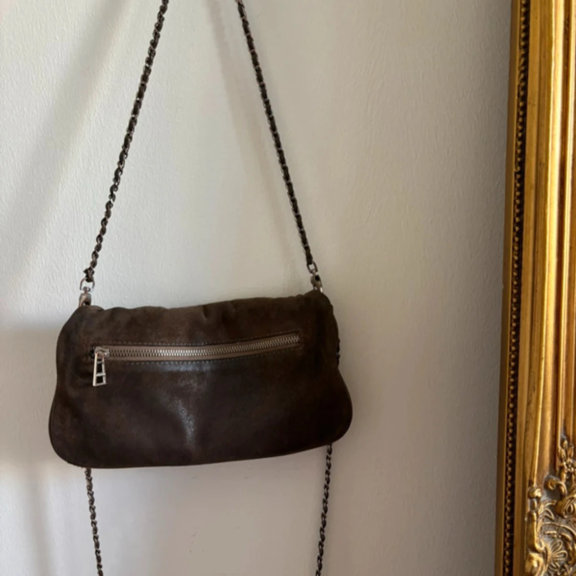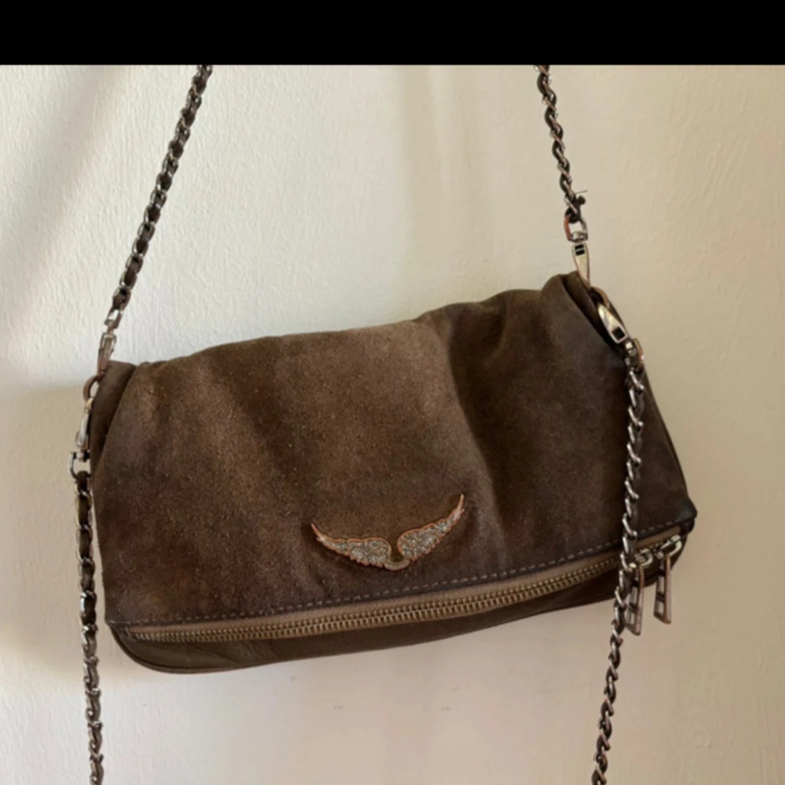 Snygg brun axelväska i mocka med silverfärgad kedjerem och dragkedja. Väskan har en cool vingdetalj framtill med glittriga stenar och en praktisk ficka med dragkedja på baksidan. Perfekt storlek för det viktigaste och ger en edgy vibe till din outfit.