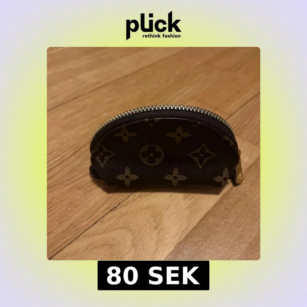 Säljer en liten brun plånbok med klassiskt monogrammönster och guldfärgad dragkedja. Perfekt för kort eller småmynt. Smidig att ha med sig i väskan eller fickan.